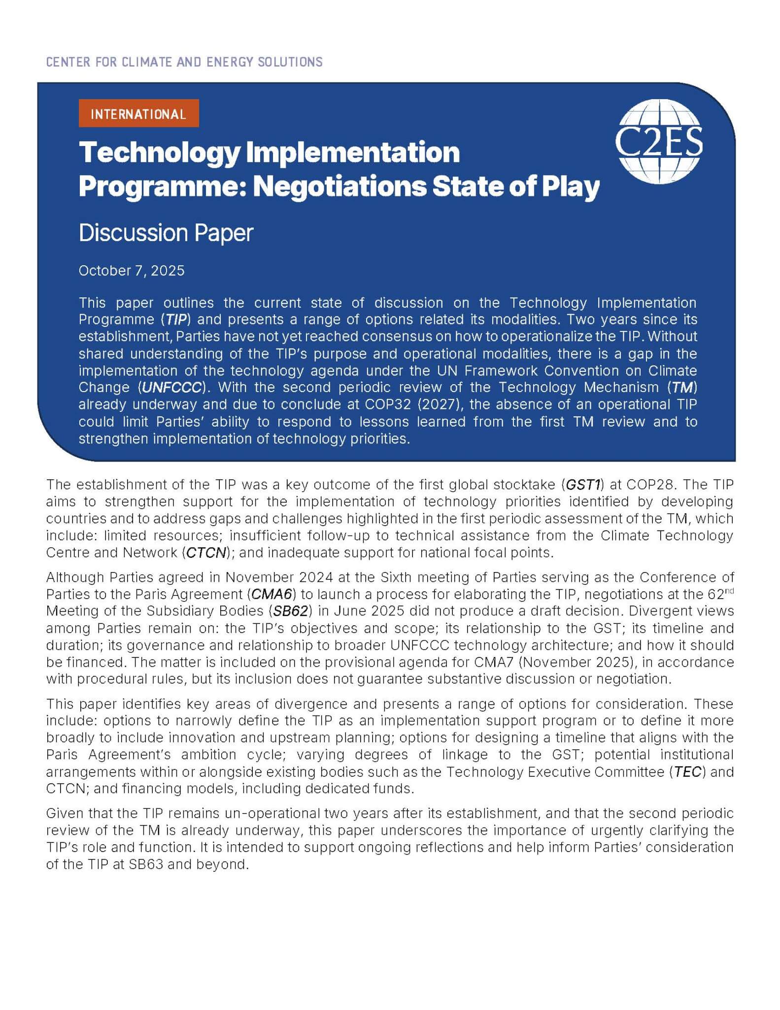 This paper outlines the current state of discussion on the Technology Implementation Programme (TIP) and presents a range of options related its modalities. Two years since its establishment, Parties have not yet reached consensus on how to operationalize the TIP. Without shared understanding of the TIP’s purpose and operational modalities, there is a gap in […]