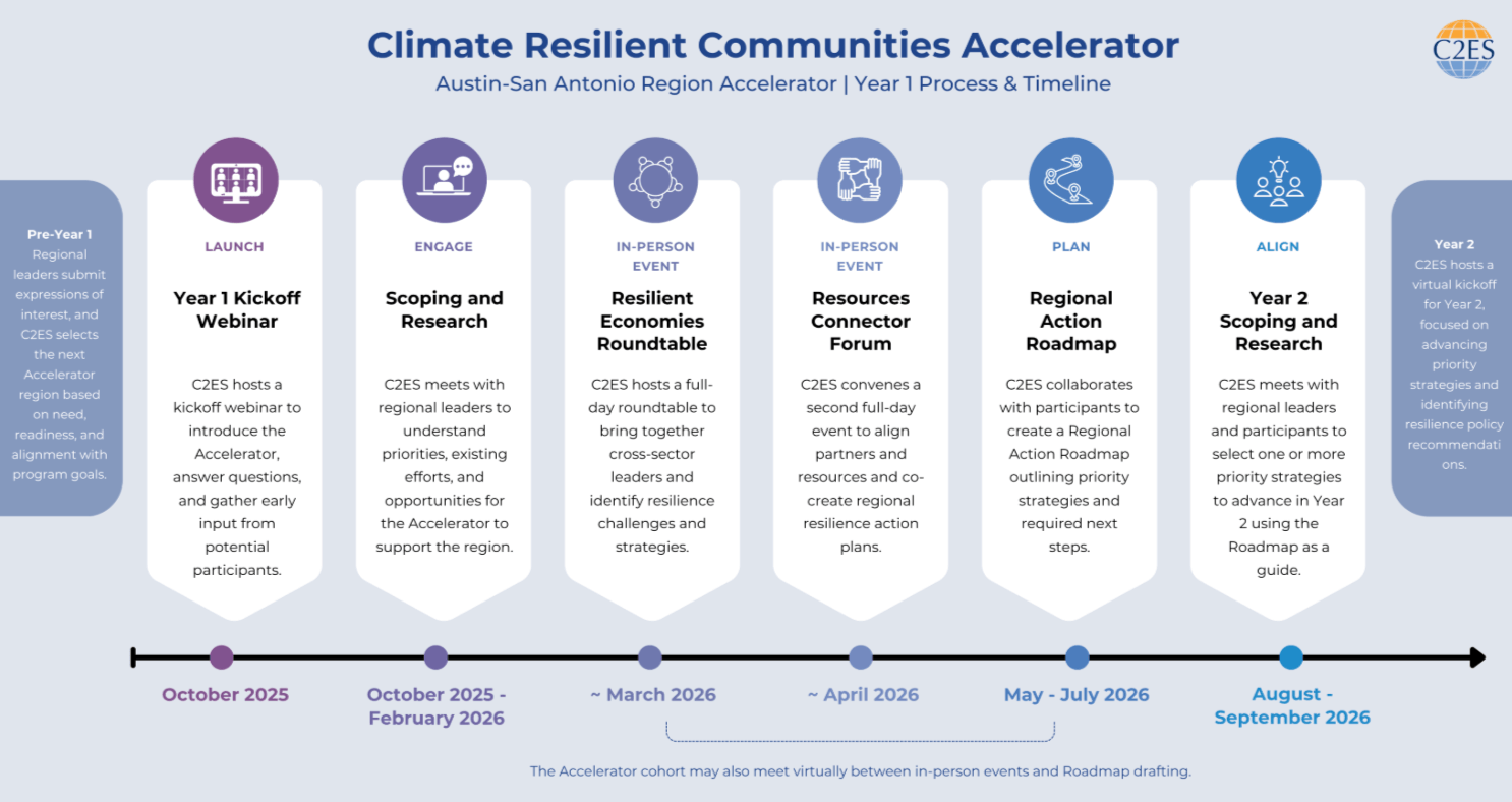 In September 2025, C2ES launched the third Climate Resilient Communities Accelerator program in the Austin-San Antonio region of Texas to support leaders from a wide range of sectors prepare for climate and extreme weather impacts.