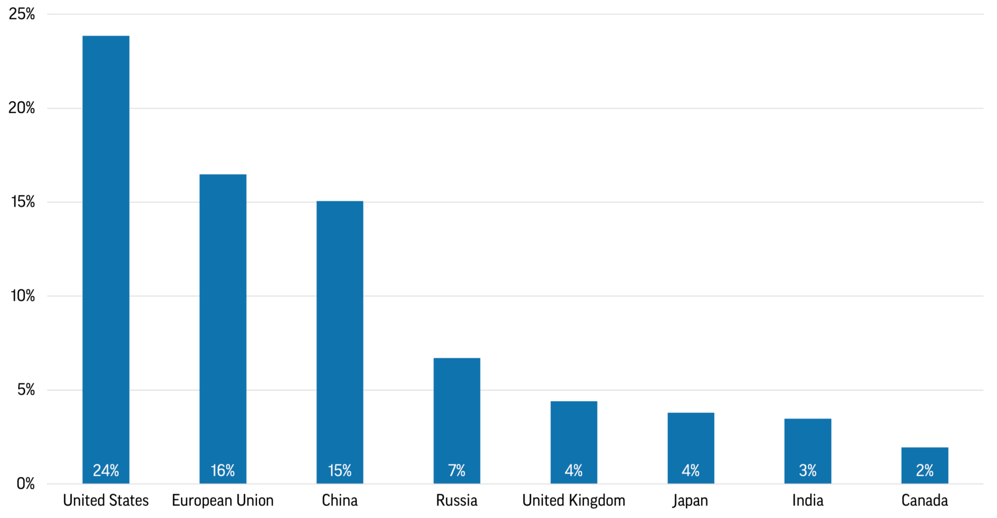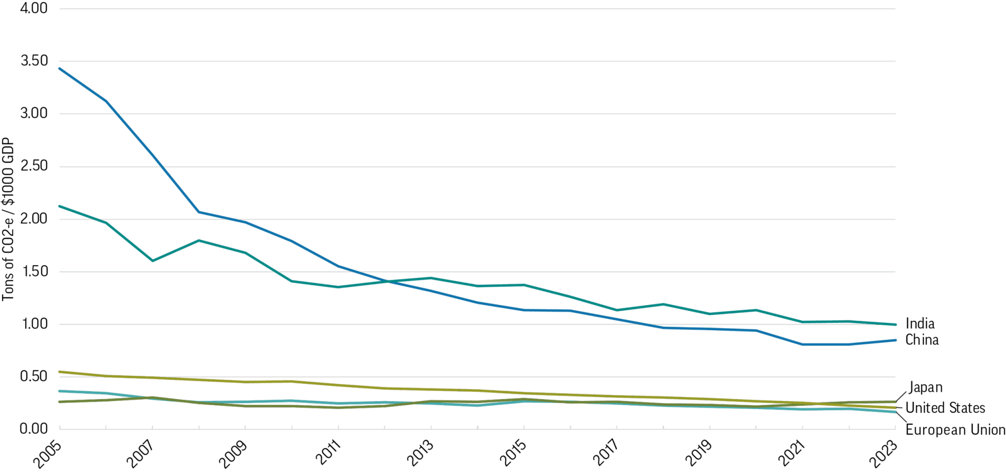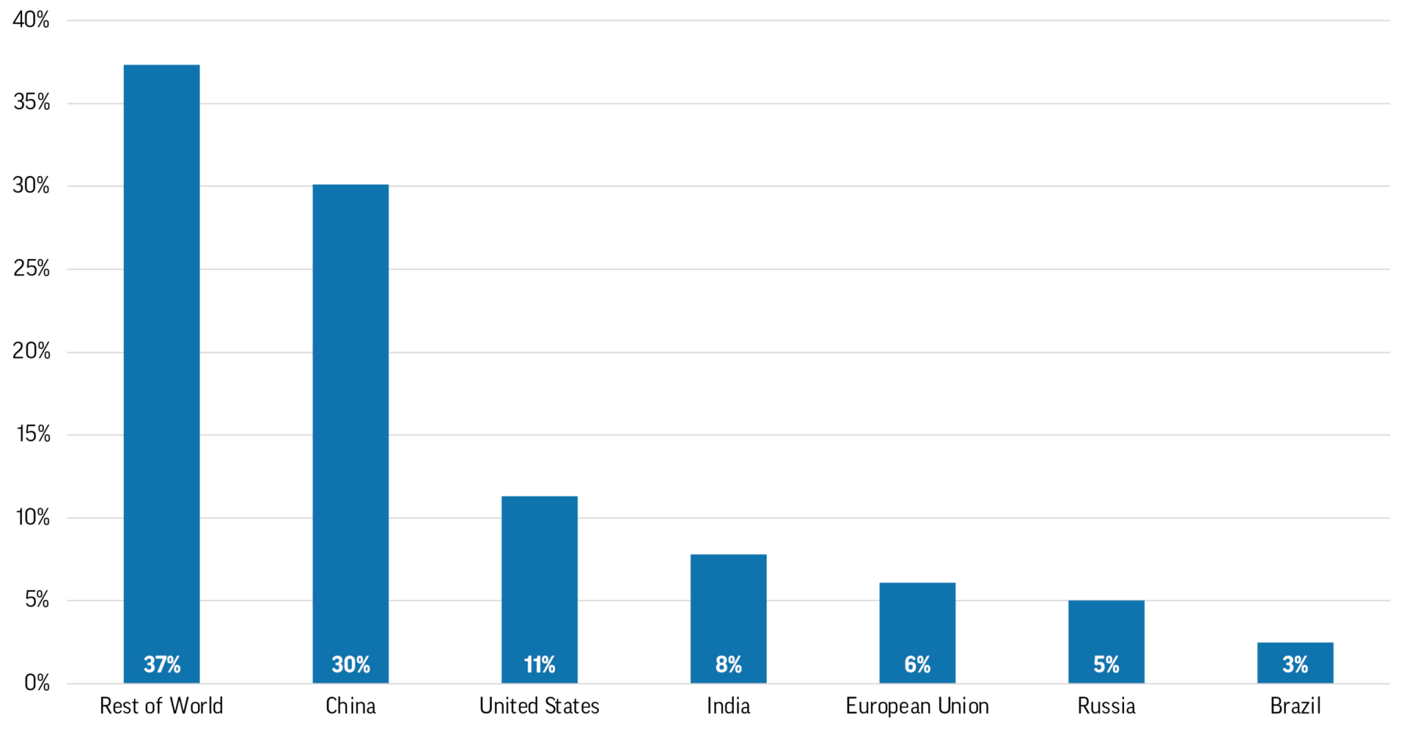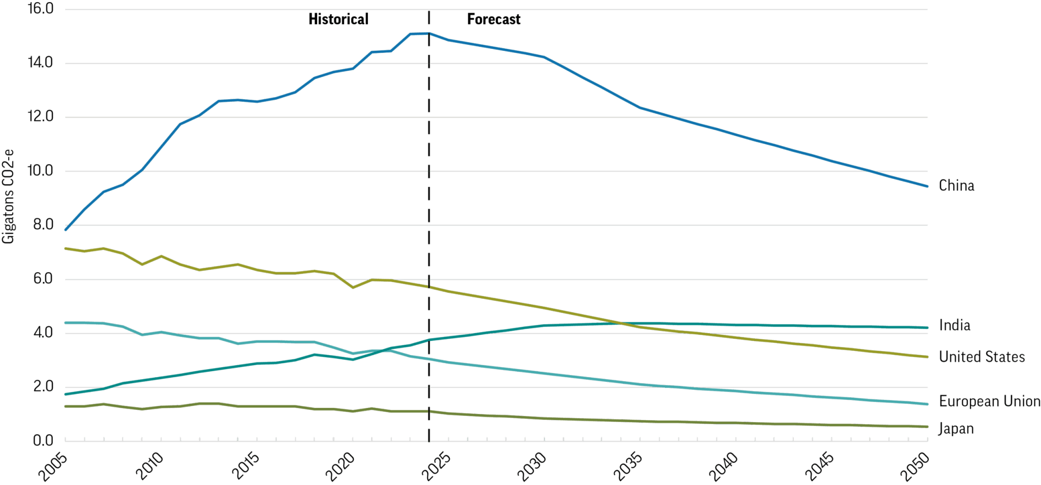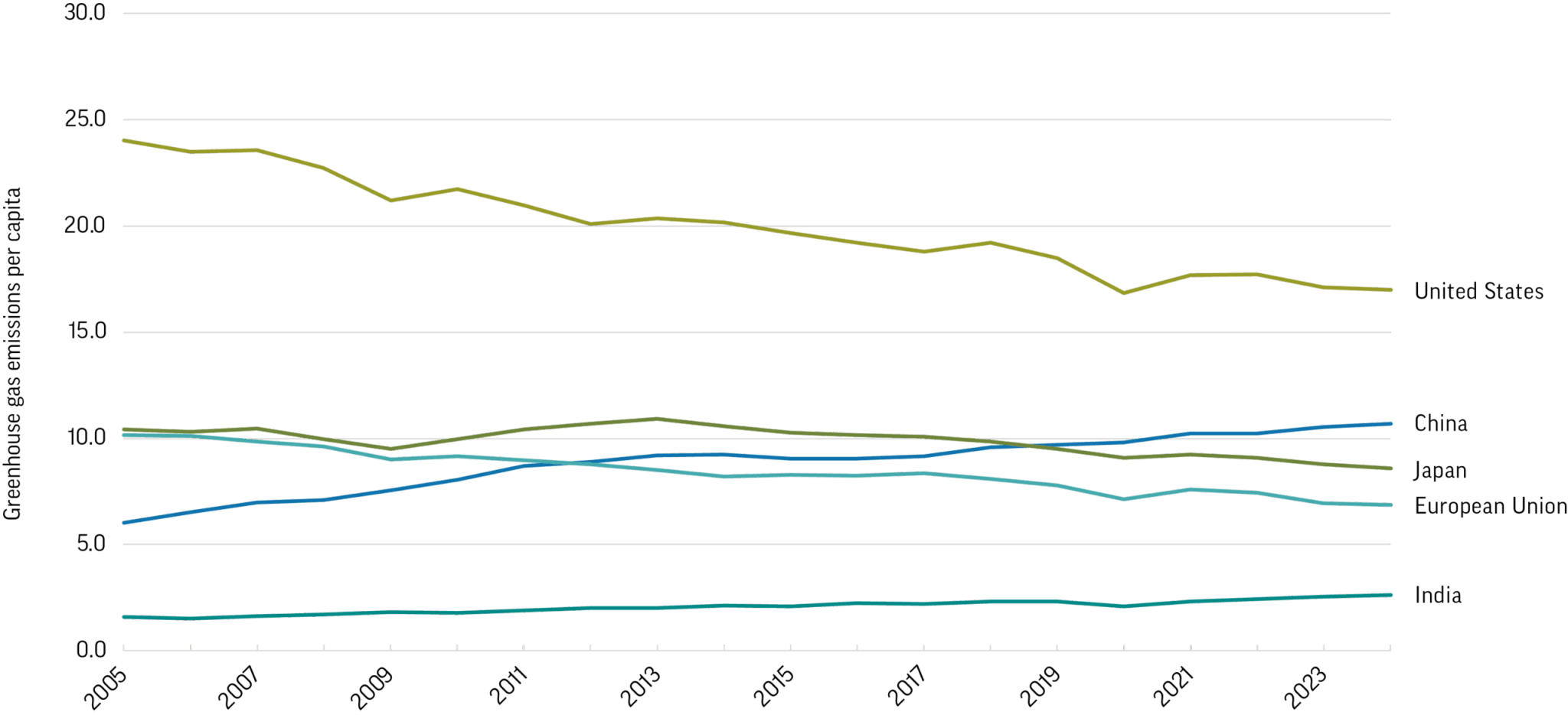 Greenhouse gas emissions, largely from the combustion of fossil fuels, have risen dramatically since the start of the industrial revolution. Most of the world’s greenhouse gas emissions come from a relatively small number of countries. China, the United States, India, and the nations that make up the European Union are the four largest emitters on an absolute basis.