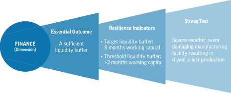 Using the model’s measurement-driven approach to resilience, series participants first identified business and service outcomes for each dimension of their organization that would be affected by climate shocks. They then explored potential indicators that could help understand how resilient this dimension of their organization is to climate change. Finally, participants discussed initial ways they could stress test the resilience of these outcomes. Figure 1 is an illustrative example. It posits an essential financial outcome, which resilience indicators would lead to the desired outcome, and a climate-related stress test. Additional examples of potential climate resilience are included in the Appendix.
