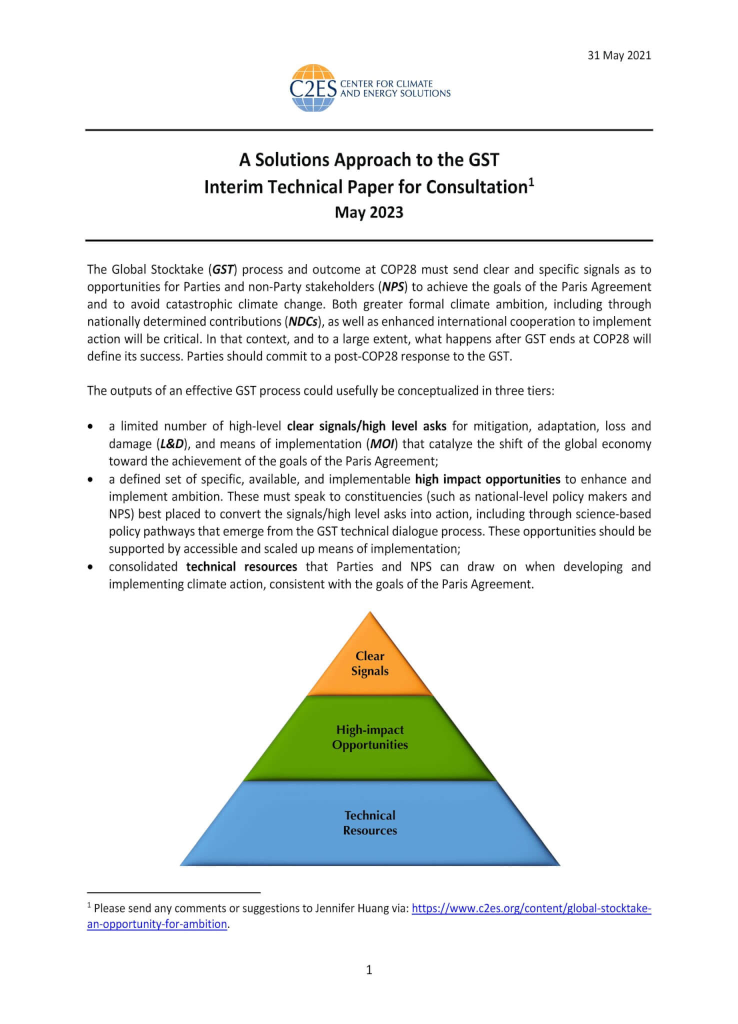Applying these criteria, this paper identifies a range of suggested signals and opportunities to action them that have the potential for accelerating climate action and support in the near term. C2ES will further test the viability of these solutions and welcomes comments and suggestions. At the same time, the general approach to identifying solutions has broader applicability to decision-makers and stakeholders looking to identify and implement actionable solutions with a near-term positive impact, including through enhanced international cooperation.