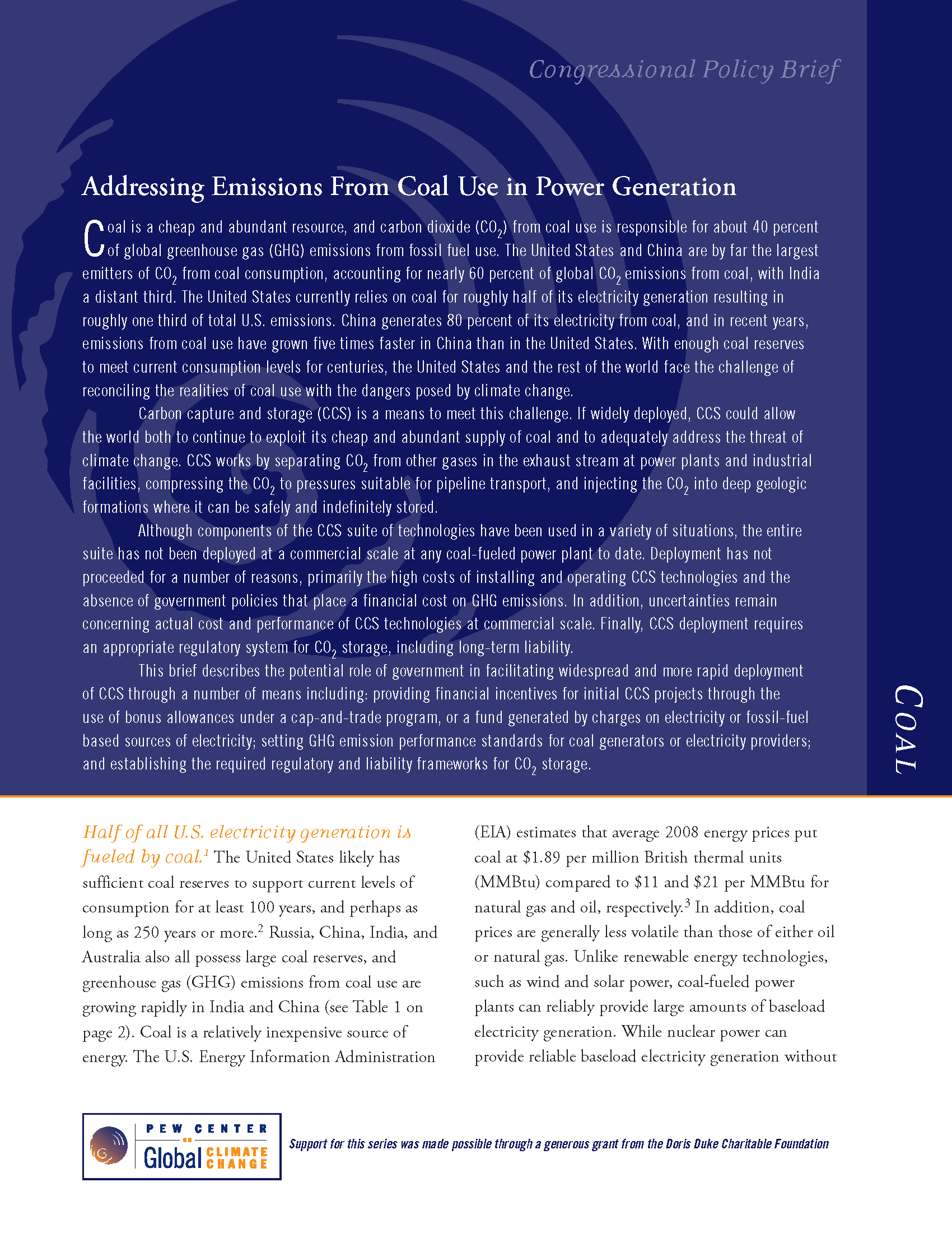 This brief describes the potential role of government in facilitating widespread and more rapid deployment of CCS through a number of means including: providing financial incentives for initial CCS projects through the use of bonus allowances under a cap-and-trade program, or a fund generated by charges on electricity or fossil-fuel based sources of electricity; setting GHG emission performance standards for coal generators or electricity providers; and establishing the required regulatory and liability frameworks for CO2 storage.