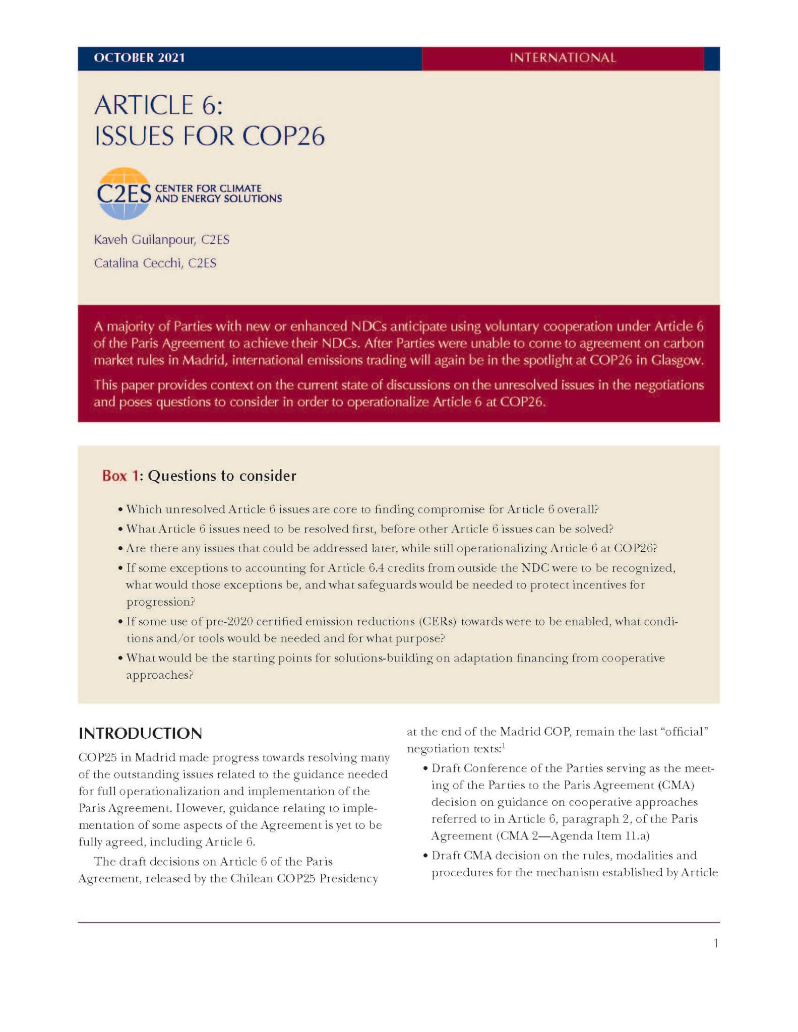 This paper provides context on the current state of discussions on the unresolved issues in the negotiations and poses questions to consider in order to operationalize Article 6 at COP26.