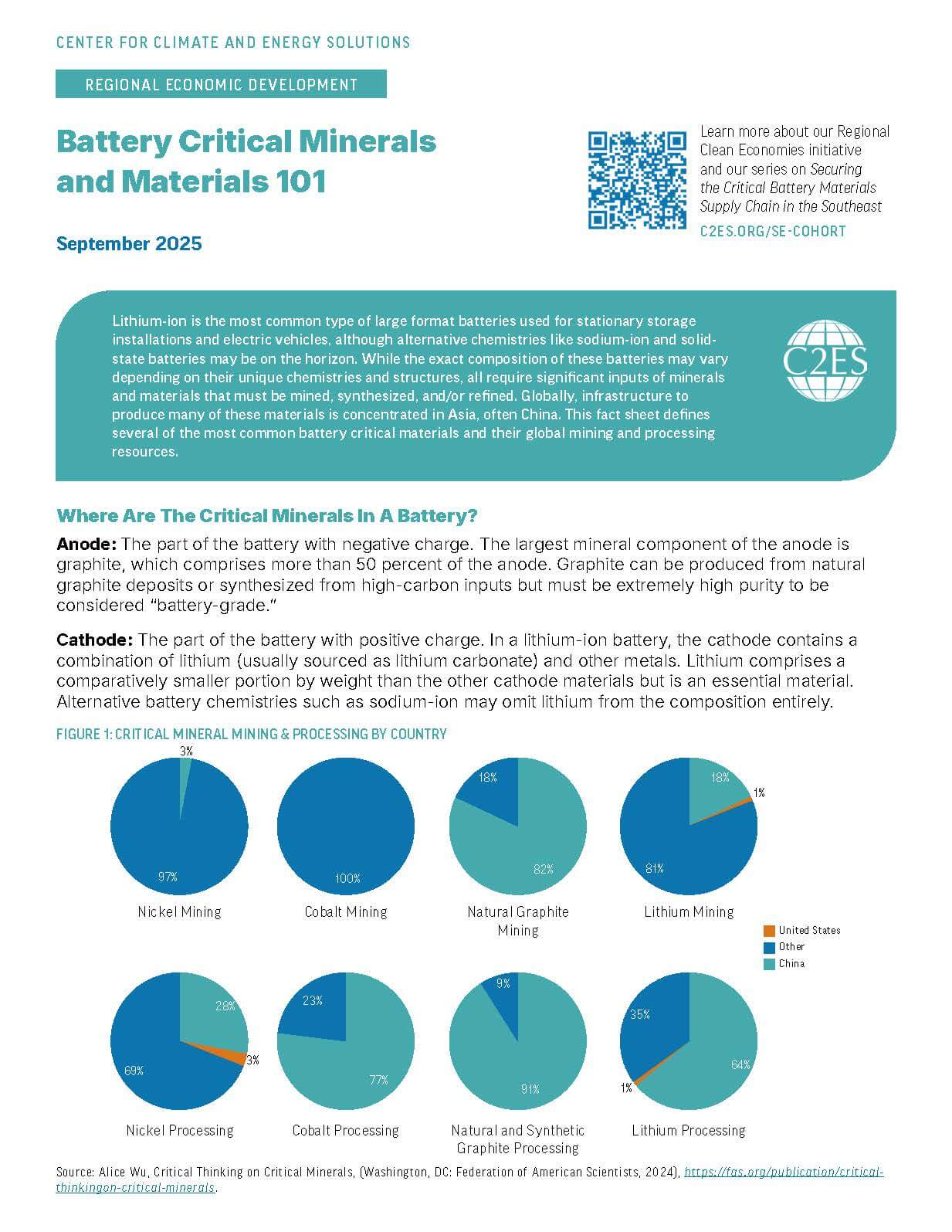 Lithium-ion is the most common type of large-format battery used for stationary storage installations and electric vehicles, although alternative chemistries like sodium-ion and solid-state batteries may be on the horizon. While the exact composition of these batteries may vary depending on their unique chemistries and structures, all require significant inputs of minerals and materials that must be mined, synthesized, and/or refined. Globally, infrastructure to produce many of these materials is concentrated in Asia, often China. This fact sheet defines several of the most common battery critical materials and their global mining and processing resources.