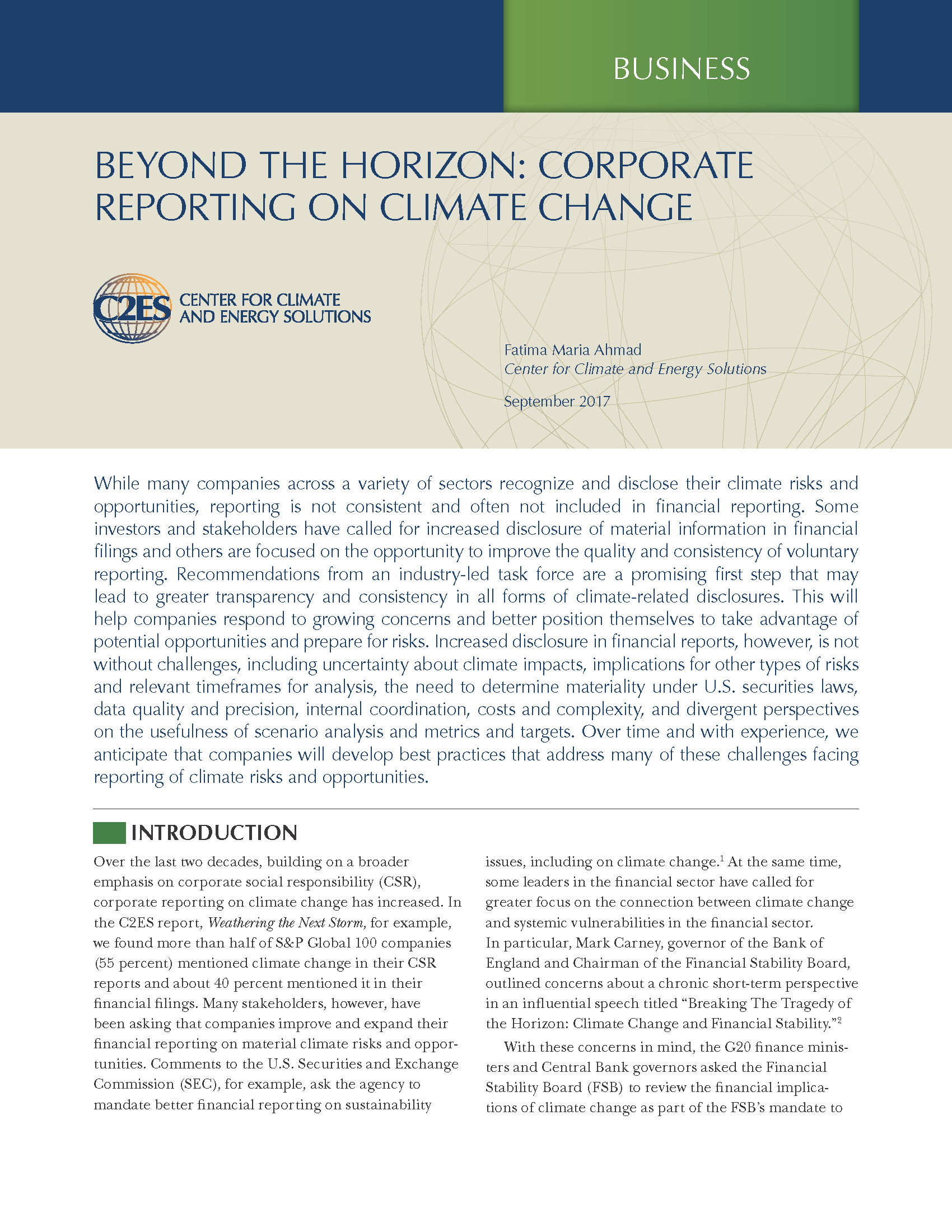 This brief reviews the types of climate-related risks and opportunities that may impact companies and explores how and where companies currently disclose information about climate risks and opportunities, including some of the challenges associated with reporting. While many companies across a variety of sectors recognize and disclose their climate risks and opportunities, reporting is not consistent and often not included in financial reporting. Some investors and stakeholders have called for increased disclosure of material information in financial filings and others are focused on the opportunity to improve the quality and consistency of voluntary reporting. Recommendations from an industry-led task force are a promising first step that may lead to greater transparency and consistency in all forms of climate-related disclosures.