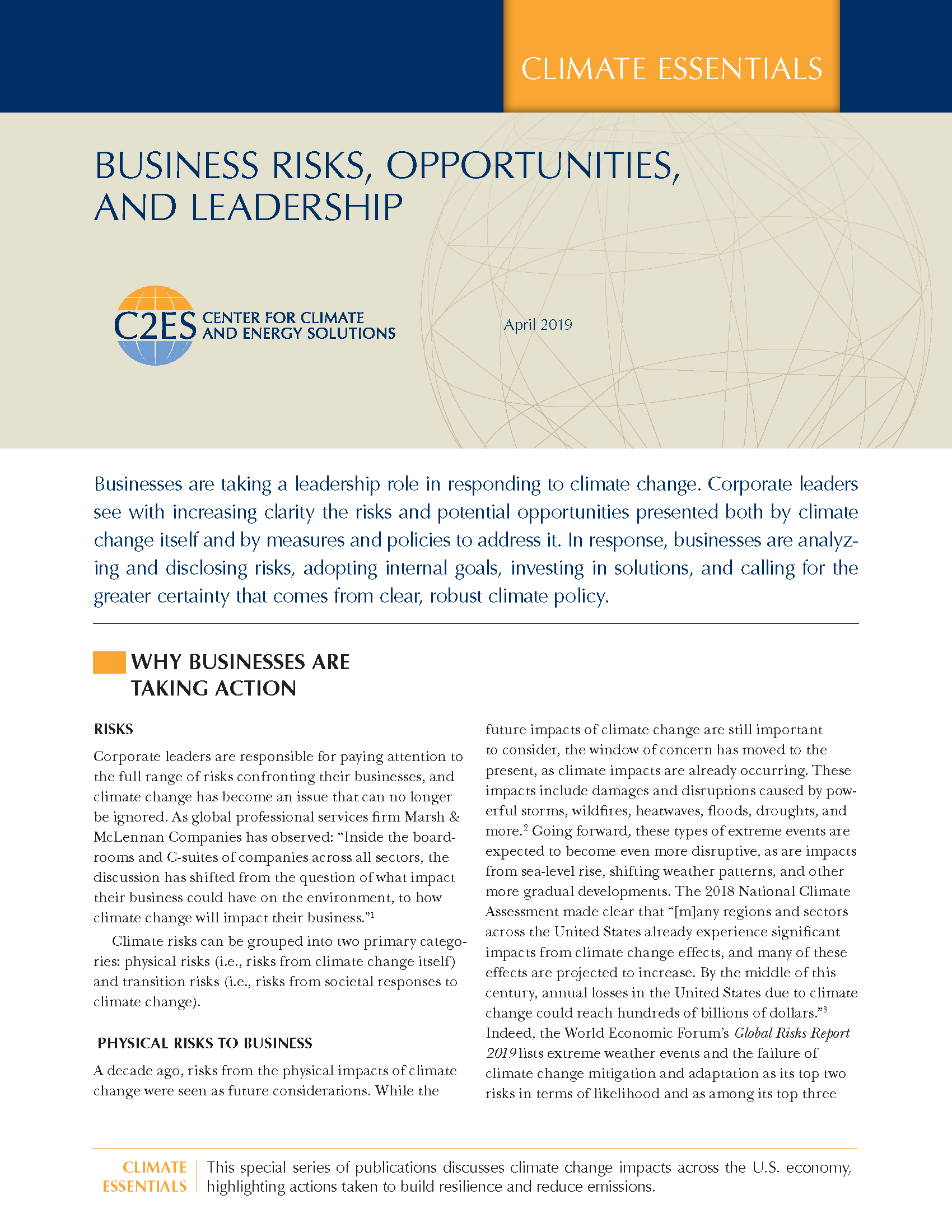 Businesses are taking a leadership role in responding to climate change. Corporate leaders see with increasing clarity the risks and potential opportunities presented both by climate change itself and by measures and policies to address it. In response, businesses are analyzing and disclosing risks, adopting internal goals, investing in solutions, and calling for the greater certainty that comes from clear, robust climate policy.