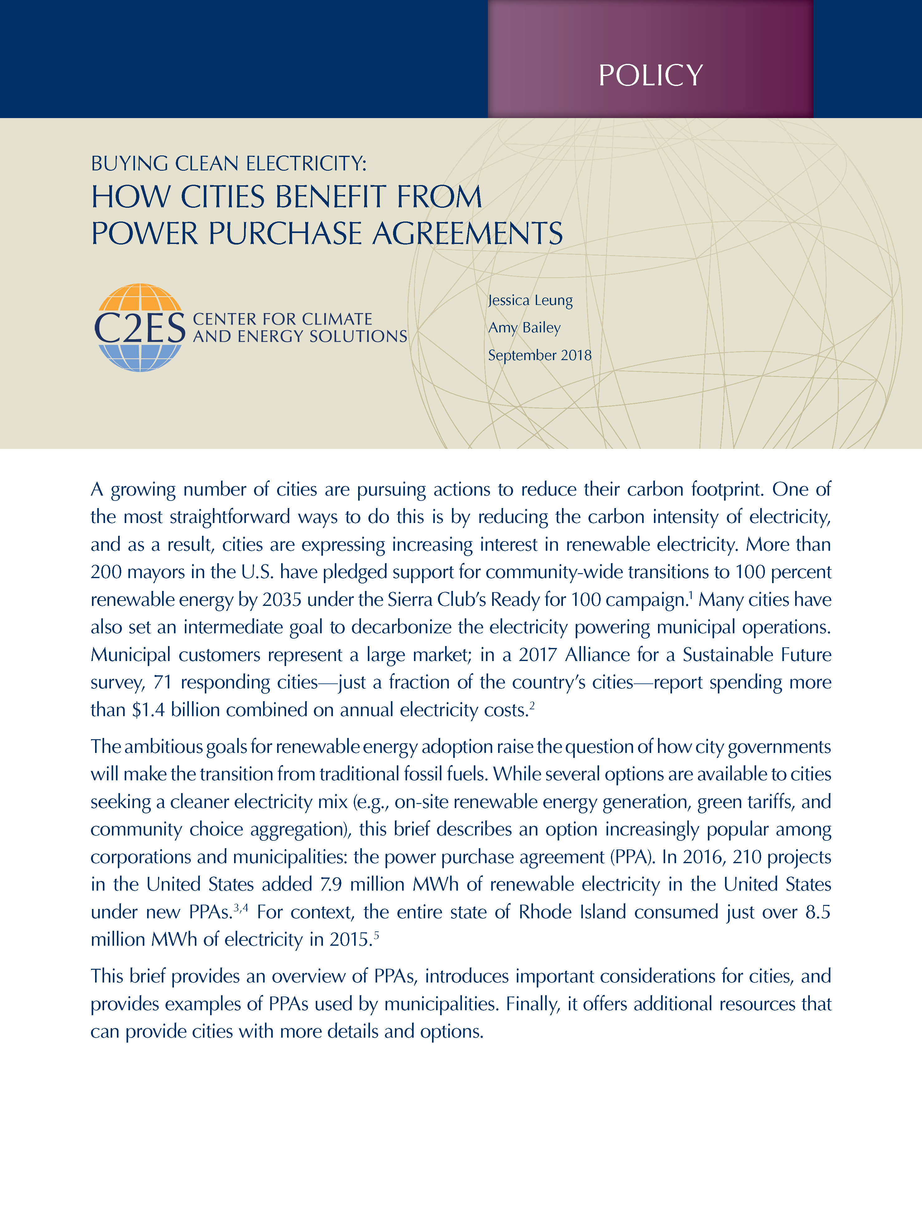 This brief provides an overview of PPAs, introduces important considerations for cities, and provides examples of PPAs used by municipalities. Finally, it offers additional resources that can provide cities with more details and options.