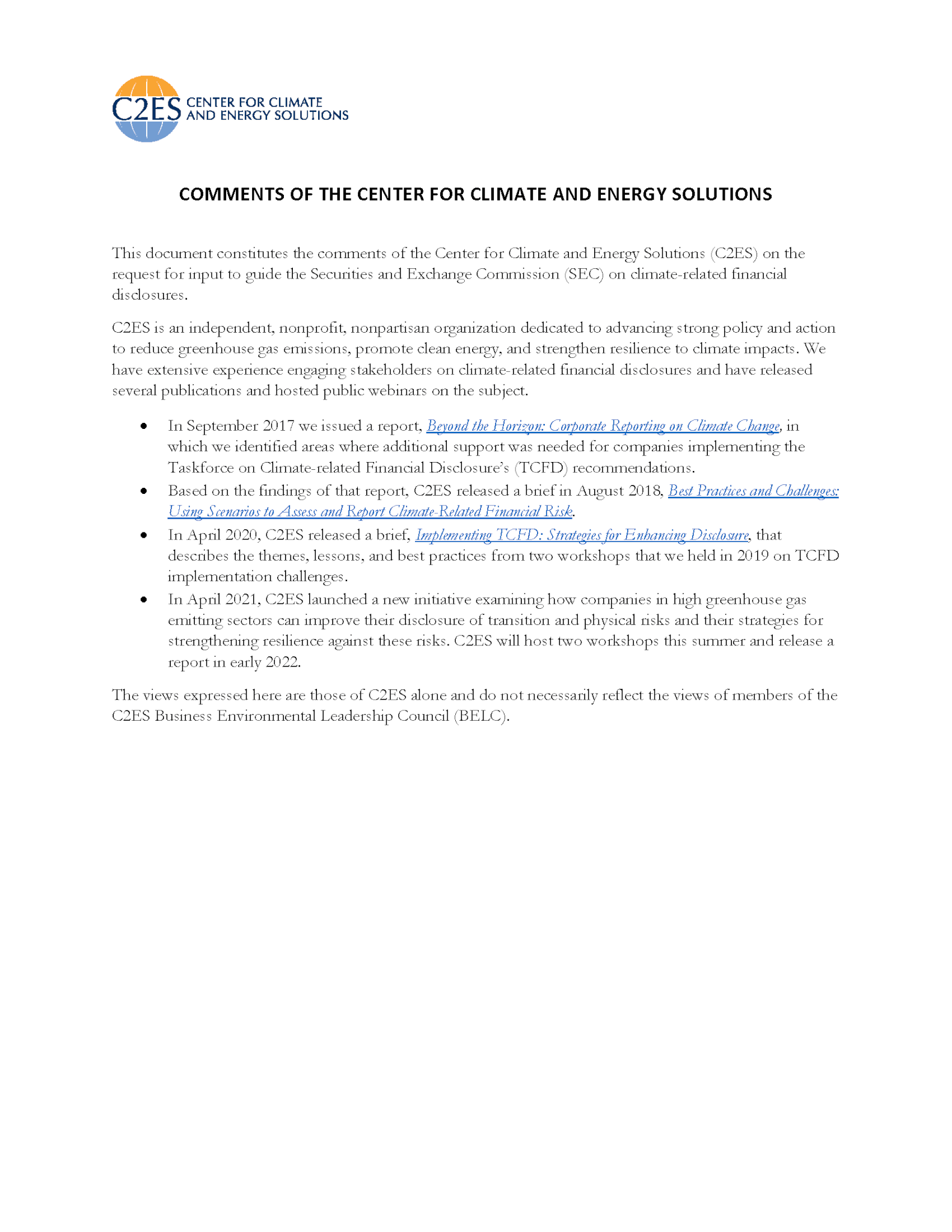 This document constitutes the comments of the Center for Climate and Energy Solutions (C2ES) on the request for input to guide the Securities and Exchange Commission (SEC) on climate-related financial disclosures.