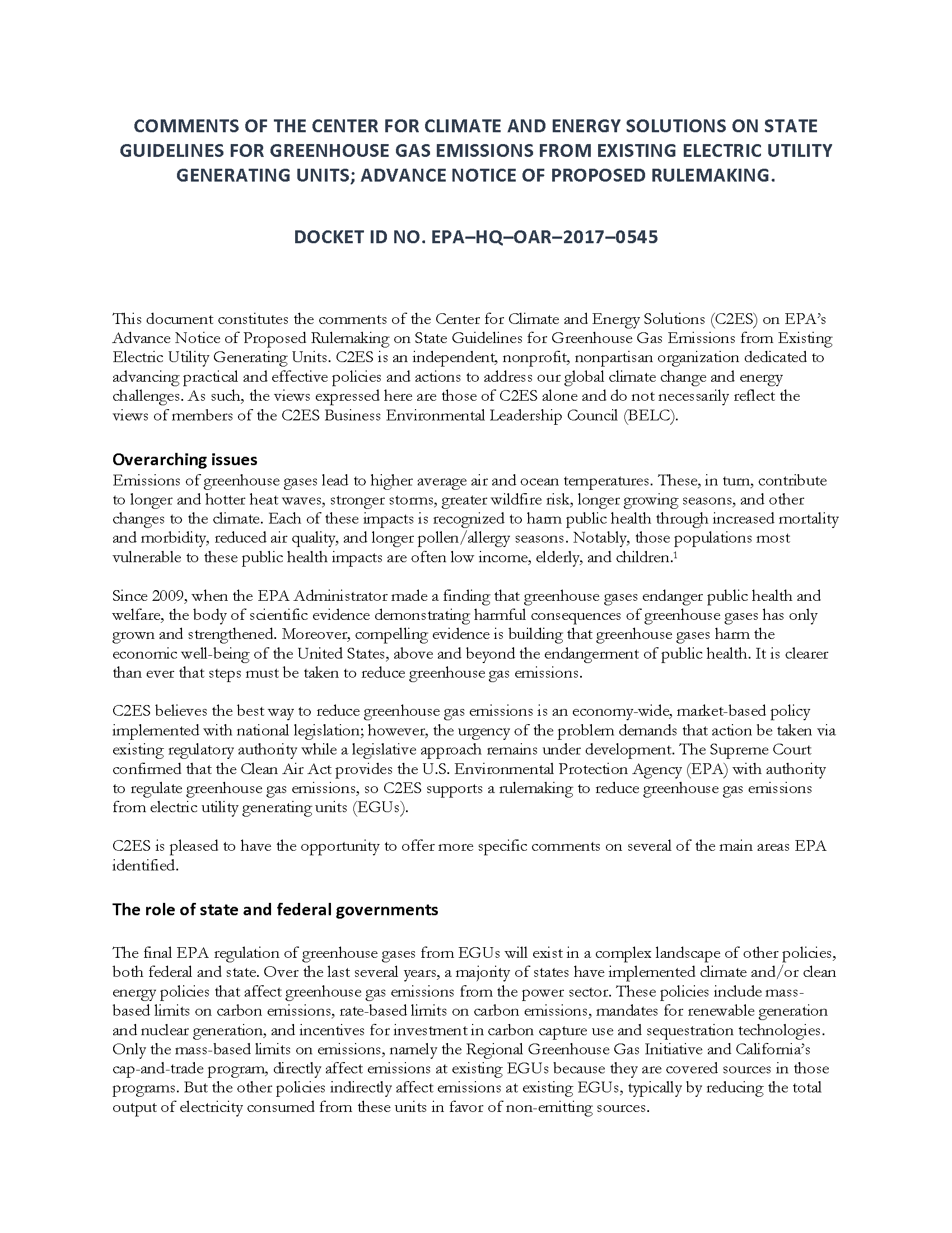 This document constitutes the comments of the Center for Climate and Energy Solutions (C2ES) on EPA’s Advance Notice of Proposed Rulemaking on State Guidelines for Greenhouse Gas Emissions from Existing Electric Utility Generating Units. C2ES is an independent, nonprofit, nonpartisan organization dedicated to advancing practical and effective policies and actions to address our global climate change and energy challenges. As such, the views expressed here are those of C2ES alone and do not necessarily reflect the views of members of the C2ES Business Environmental Leadership Council (BELC).