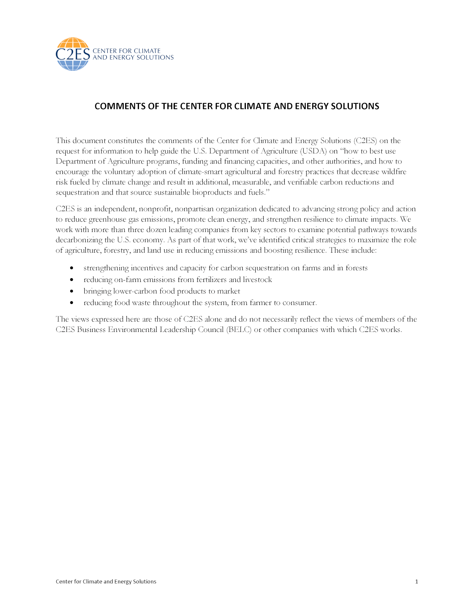 This document constitutes the comments of the Center for Climate and Energy Solutions (C2ES) on the request for information to help guide the U.S. Department of Agriculture (USDA) on “how to best use Department of Agriculture programs, funding and financing capacities, and other authorities, and how to encourage the voluntary adoption of climate-smart agricultural and forestry practices that decrease wildfire risk fueled by climate change and result in additional, measurable, and verifiable carbon reductions and sequestration and that source sustainable bioproducts and fuels.”