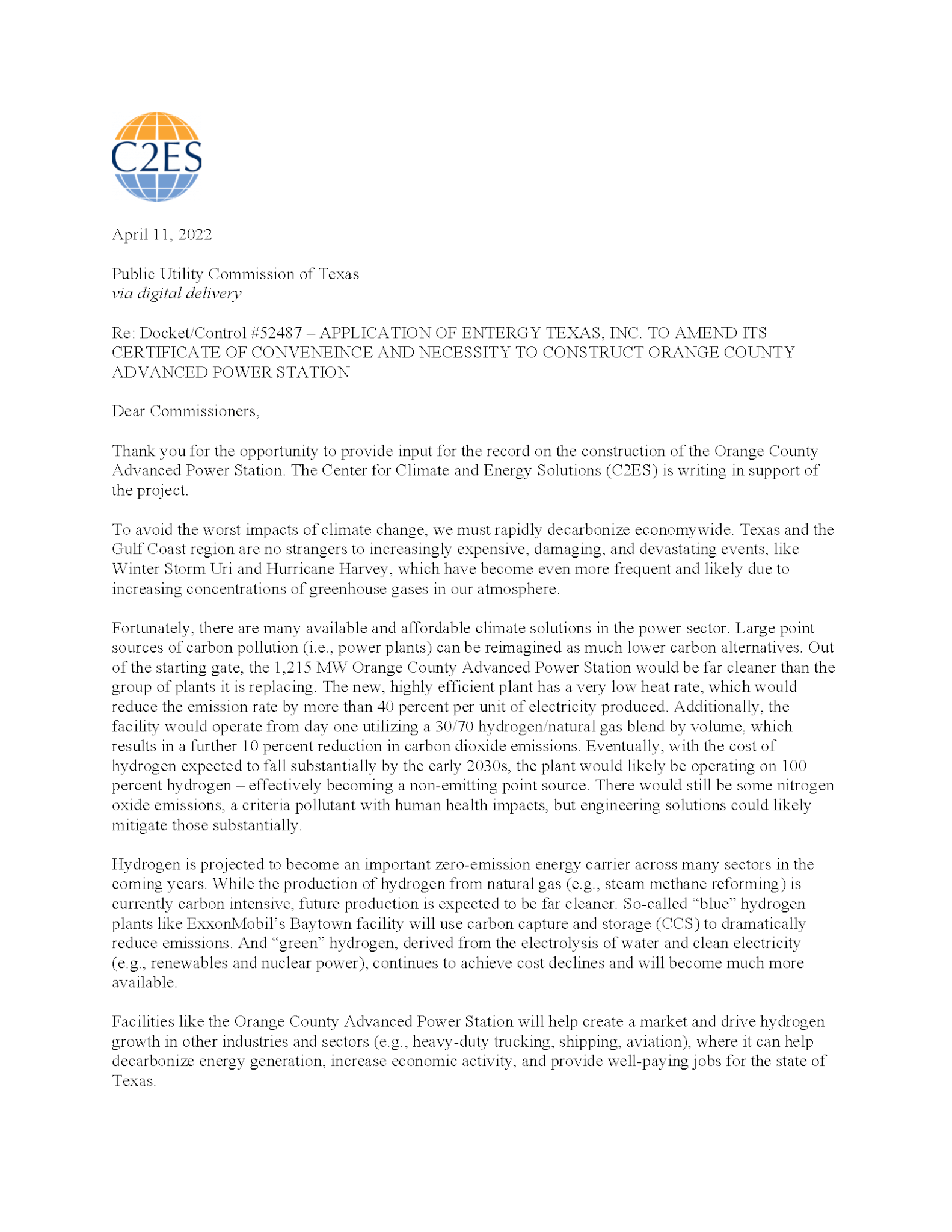 Thank you for the opportunity to provide input for the record on the construction of the Orange County Advanced Power Station. The Center for Climate and Energy Solutions (C2ES) is writing in support of the project.