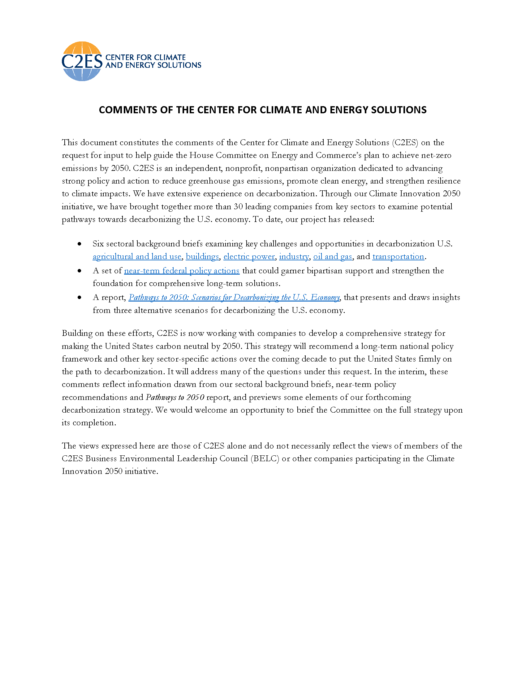 This document constitutes the comments of the Center for Climate and Energy Solutions (C2ES) on the request for input to help guide the House Committee on Energy and Commerce’s plan to achieve net-zero emissions by 2050. C2ES is an independent, nonprofit, nonpartisan organization dedicated to advancing strong policy and action to reduce greenhouse gas emissions, promote clean energy, and strengthen resilience to climate impacts.