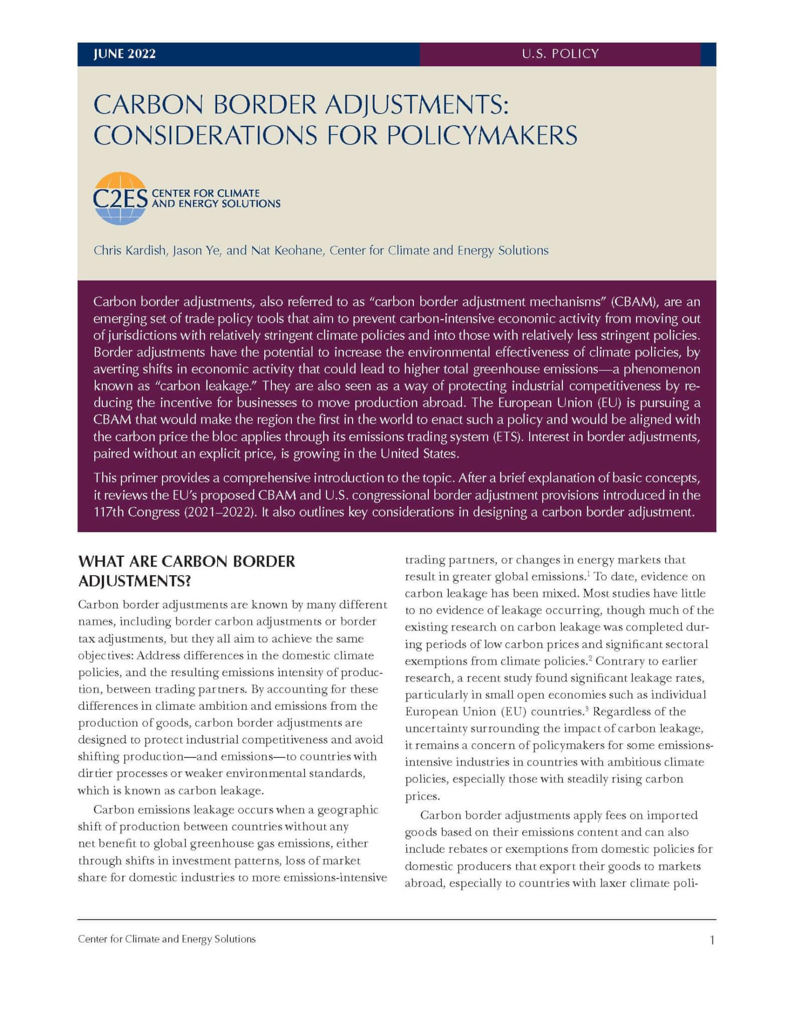 This primer provides a comprehensive introduction to the topic. After a brief explanation of basic concepts, it reviews the EU’s proposed CBAM and U.S. congressional border adjustment provisions introduced in the 117th Congress (2021–2022). It also outlines key considerations in designing a carbon border adjustment.