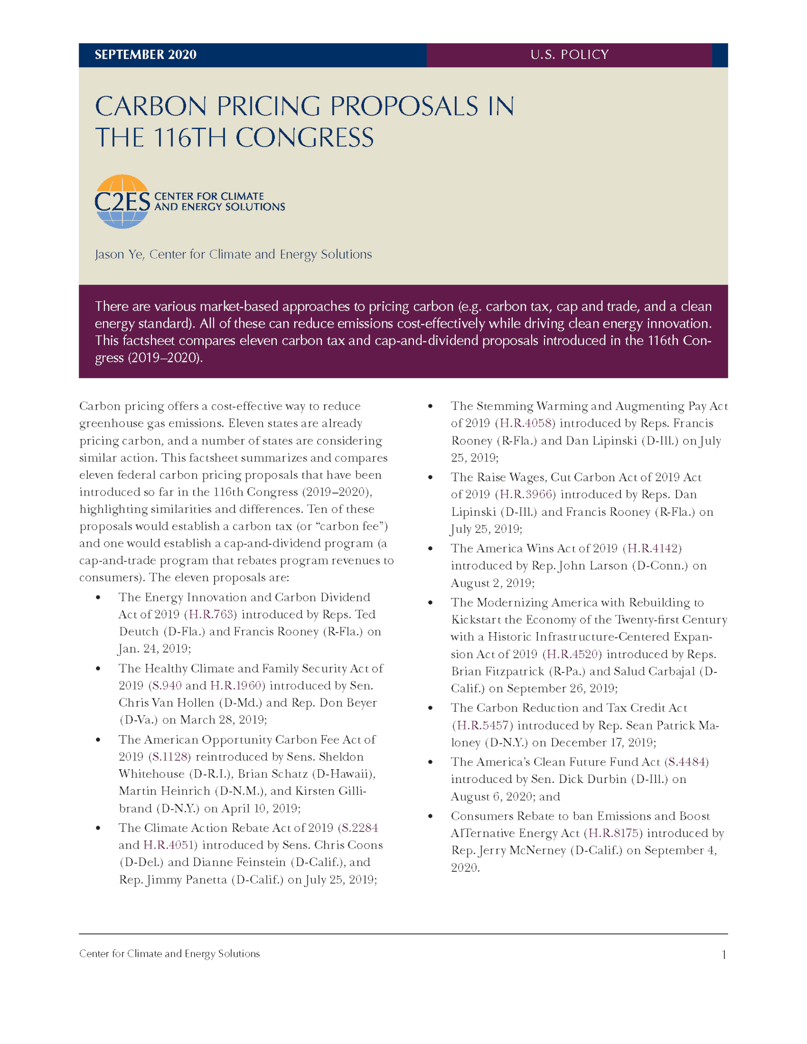 There are various market-based approaches to pricing carbon (e.g. carbon tax, cap and trade, and a clean energy standard). All of these can reduce emissions cost-effectively while driving clean energy innovation. This factsheet compares eleven carbon tax and cap-and-dividend proposals introduced in the 116th Congress (2019โ2020). The eleven proposals are:
