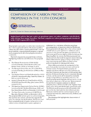 Six proposals to put a price on carbon were introduced in the 113th Congress (2013-2014). Five would establish a carbon tax (also called a “carbon pollution fee”) and one would establish a cap-and-dividend program (a cap-and-trade program that would rebate program revenues to consumers).