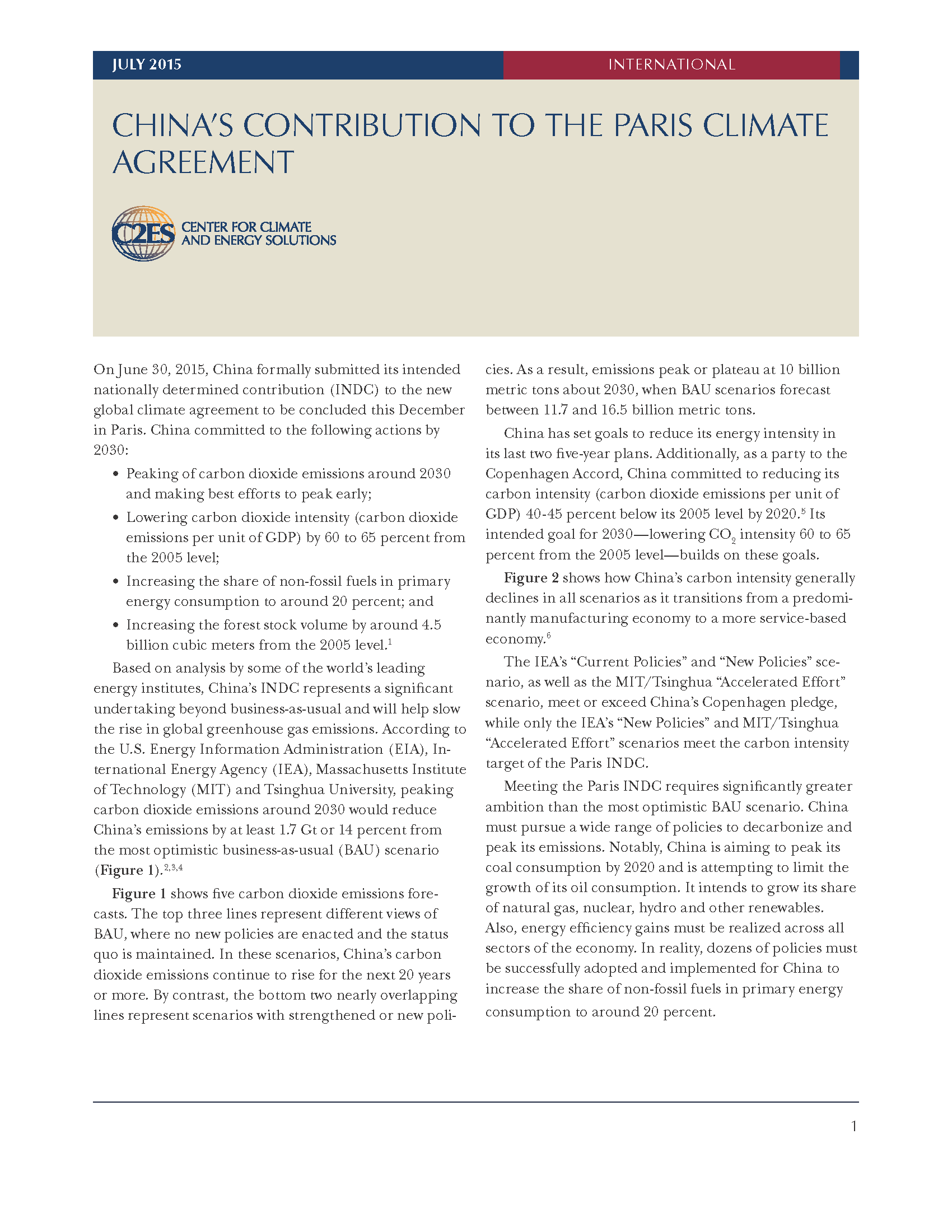 Based on analysis by some of the world’s leading energy institutes, China’s INDC represents a significant undertaking beyond business-as-usual and will help slow the rise in global greenhouse gas emissions. According to the U.S. Energy Information Administration (EIA), International Energy Agency (IEA), Massachusetts Institute of Technology (MIT) and Tsinghua University, peaking carbon dioxide emissions around 2030 would reduce China’s emissions by at least 1.7 Gt or 14 percent from the most optimistic business-as-usual (BAU) scenario