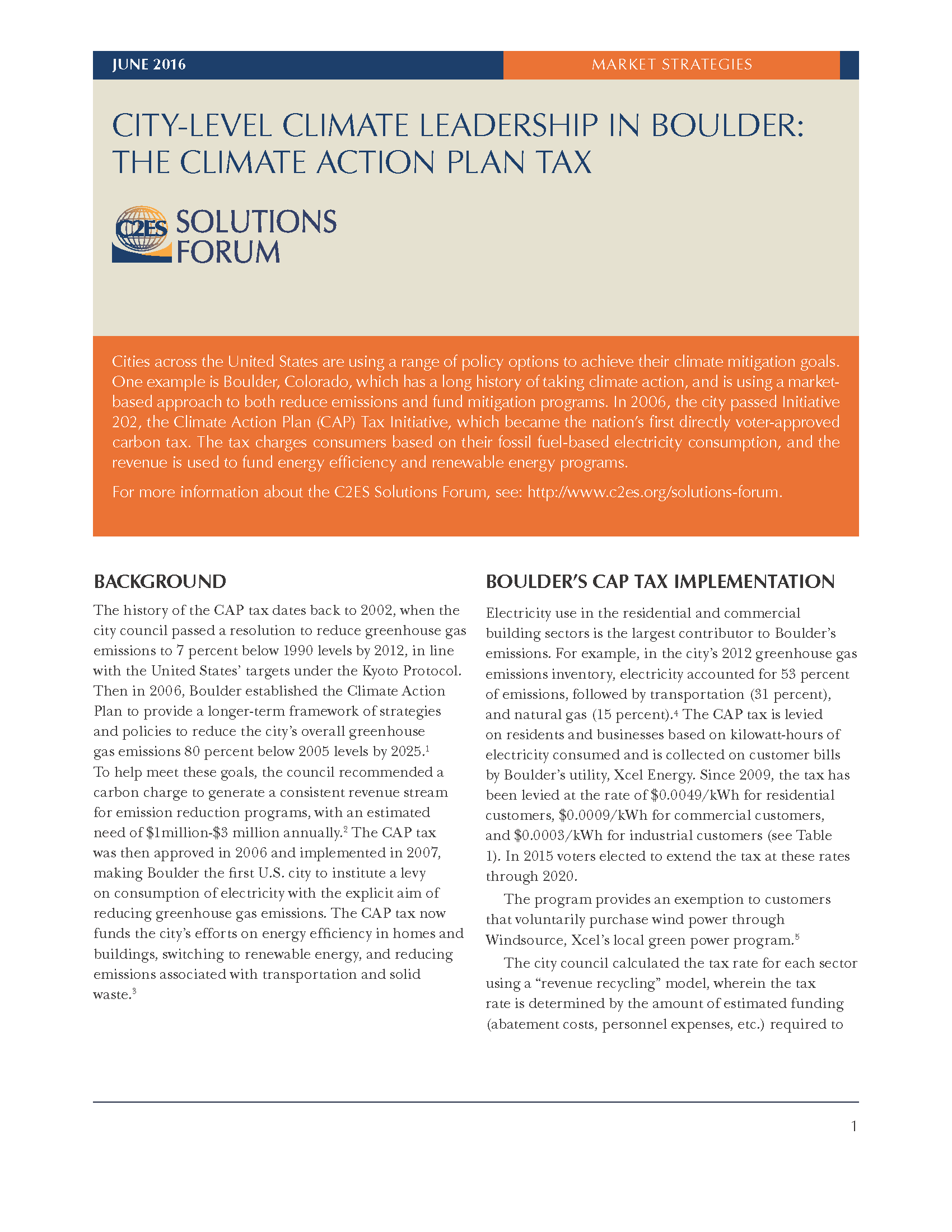 Cities across the United States are using a range of policy options to achieve their climate mitigation goals. One example is Boulder, Colorado, which has a long history of taking climate action, and is using a market-based approach to both reduce emissions and fund mitigation programs. In 2006, the city passed Initiative 202, the Climate Action Plan (CAP) Tax Initiative, which became the nation’s first directly voter-approved carbon tax. The tax charges consumers based on their fossil fuel-based electricity consumption, and the revenue is used to fund energy efficiency and renewable energy programs.