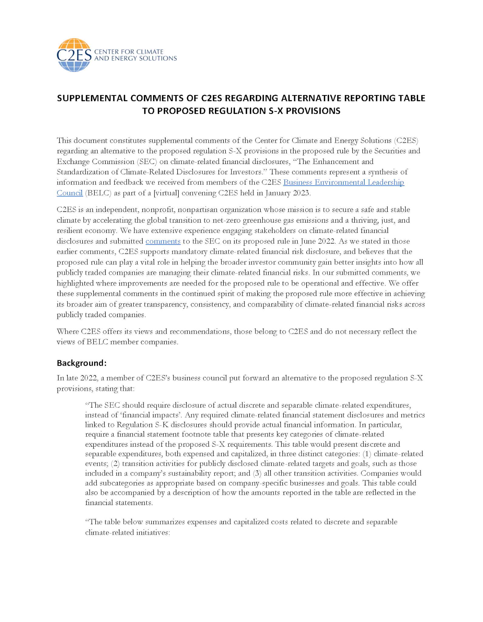 This document constitutes supplemental comments of the Center for Climate and Energy Solutions (C2ES) regarding an alternative to the proposed regulation S-X provisions in the proposed rule by the Securities and Exchange Commission (SEC) on climate-related financial disclosures, “The Enhancement and Standardization of Climate-Related Disclosures for Investors.” These comments represent a synthesis of information and feedback we received from members of the C2ES Business Environmental Leadership Council (BELC) as part of a [virtual] convening C2ES held in January 2023.