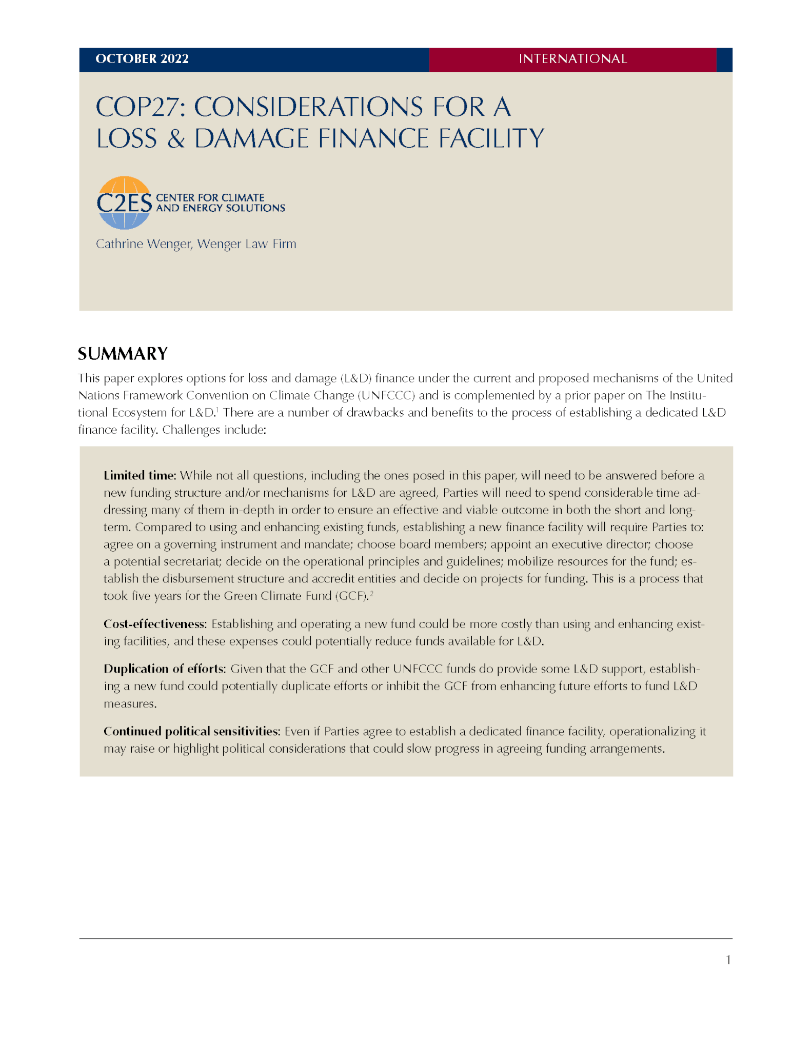 This paper explores options for loss and damage (L&D) finance under the current and proposed mechanisms of the United Nations Framework Convention on Climate Change and is complemented by a prior paper on The Institutional Ecosystem for L&D. There are a number of drawbacks and benefits to the process of establishing a dedicated L&D finance facility. Challenges include limited time, cost effectiveness, duplication of efforts, and continued political sensitivities to the issue. On the other hand, the benefits of a dedicated L&D finance facility include broadening political support, filling existing finance gaps, avoiding finance constraints, deepening understanding of the issue, and providing more consistent funding.