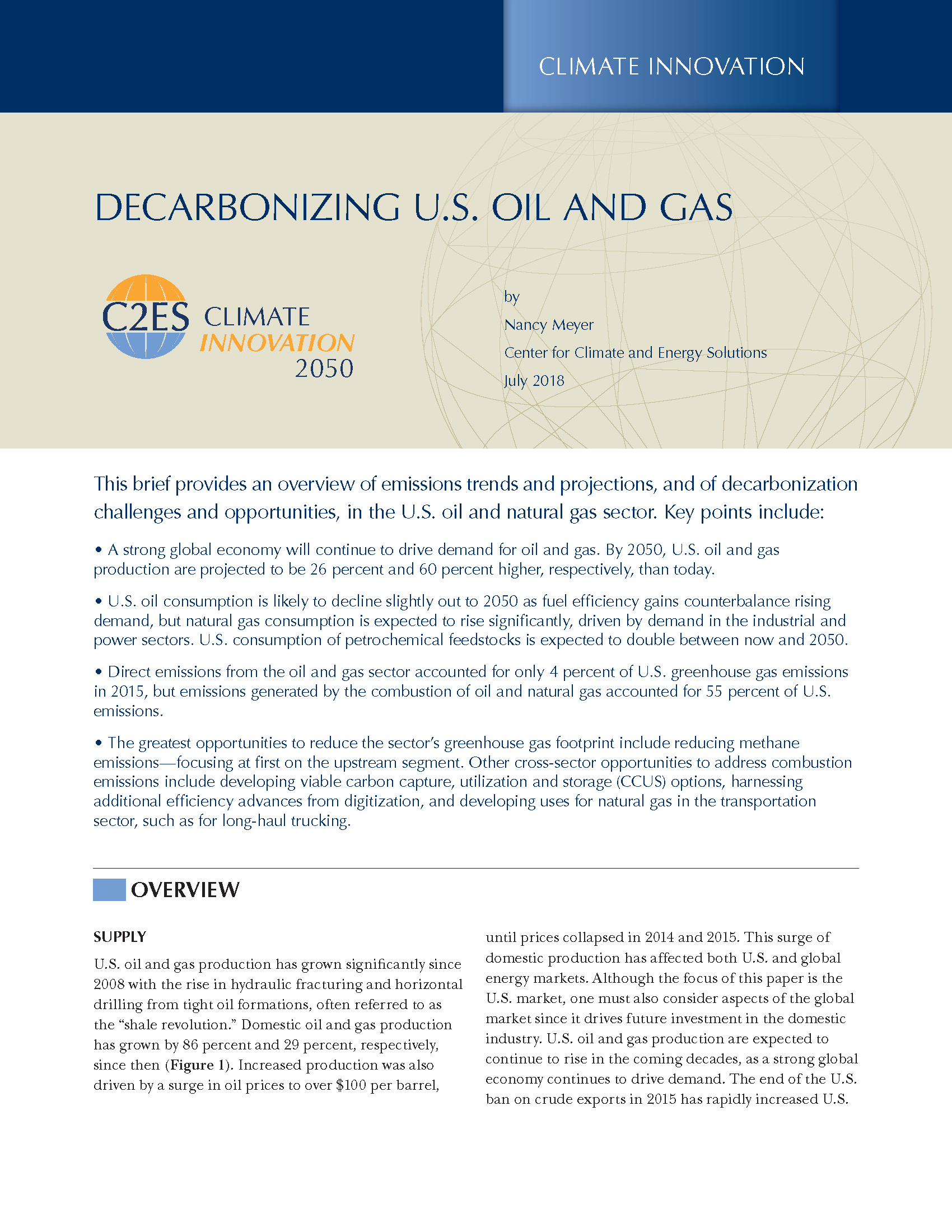 This brief provides an overview of emissions trends and projections, and of decarbonization challenges and opportunities, in the U.S. oil and natural gas sector. Key points include: