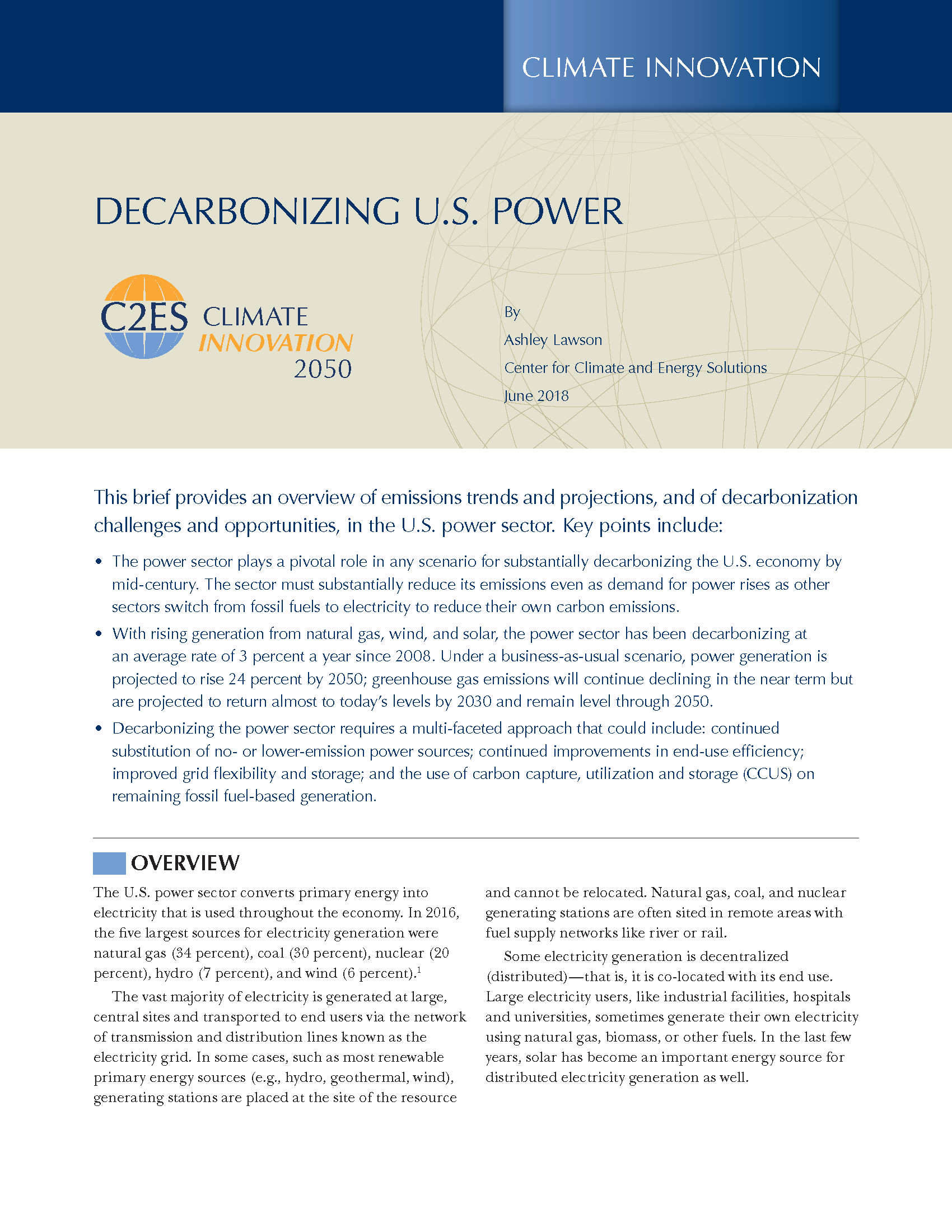 This is one in a series of briefs prepared as part of C2ES’s Climate Innovation 2050 initiative, which brings together leading companies to examine potential pathways toward substantially decarbonizing the U.S. economy. Other briefs focus on Agriculture & Forestry, Buildings, Manufacturing, Oil & Gas, and Transportation. (Note: Full citations to supporting materials can be found in the pdf version of this brief.)