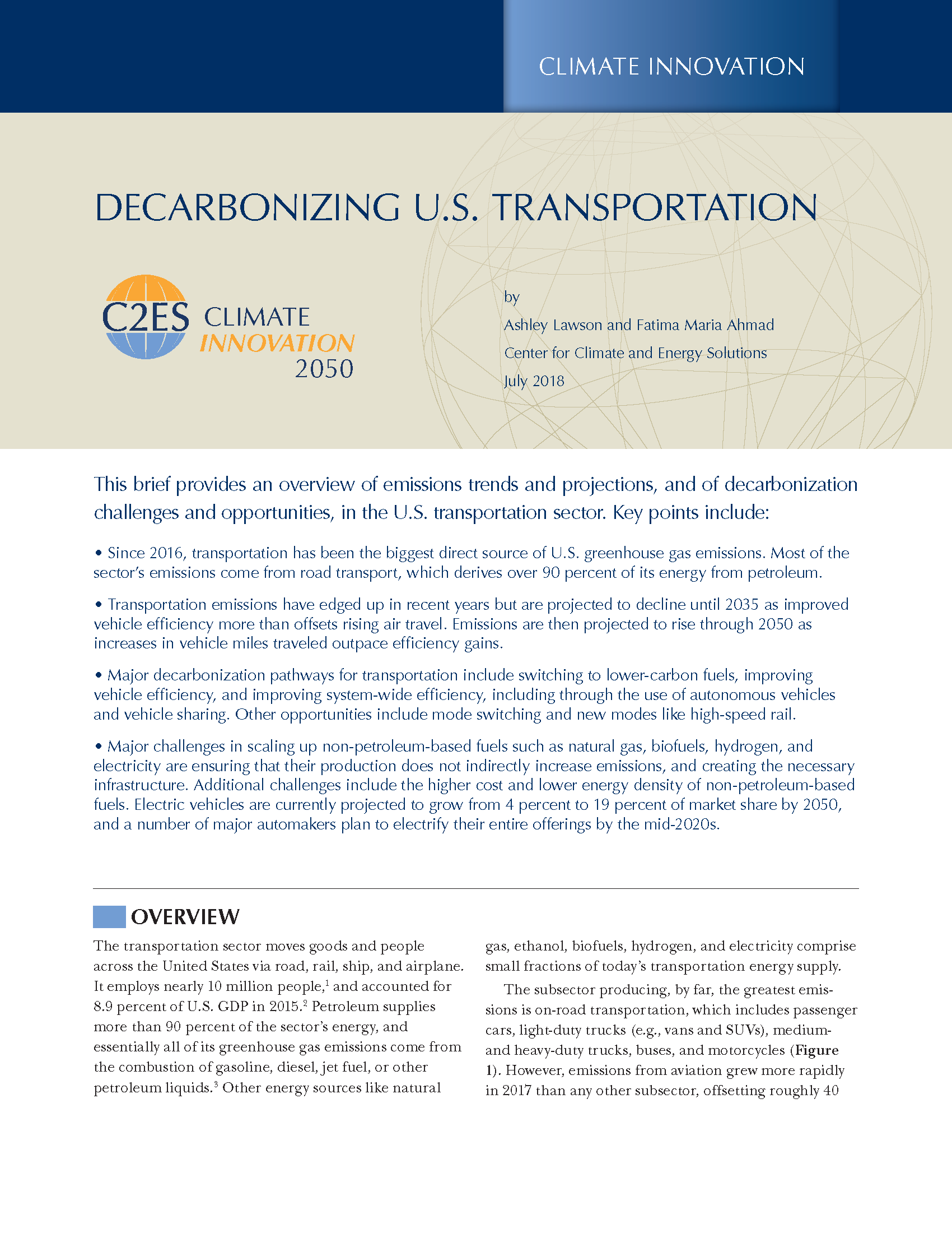 This is one in a series of briefs prepared as part of C2ES’s Climate Innovation 2050 initiative, which brings together leading companies to examine potential pathways toward substantially decarbonizing the U.S. economy. Other briefs focus on Agriculture & Forestry, Buildings, Oil & Gas, Manufacturing, and Power Generation. (Note: Full citations to supporting materials can be found in the pdf version of this brief.)