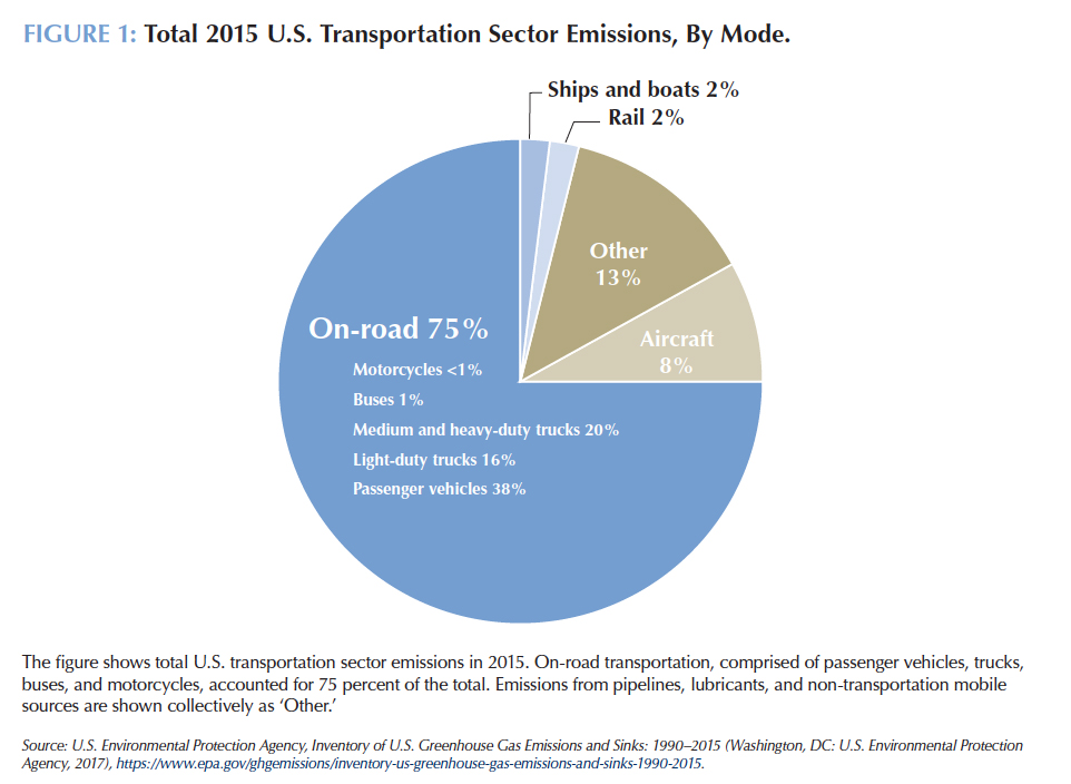 Decarbonization Opportunities and ChallengesPotential decarbonization pathways in the transportation sector include the use of lower-carbon fuels, improved vehicle efficiency, improved system-wide efficiency, and mode switching (e.g., from passenger vehicles to mass transit or from air to high-speed rail). While each of these strategies applies to some degree across all transportation modes, the primary focus here is on-road transportation, which accounts for three-quarters of the sector’s emissions