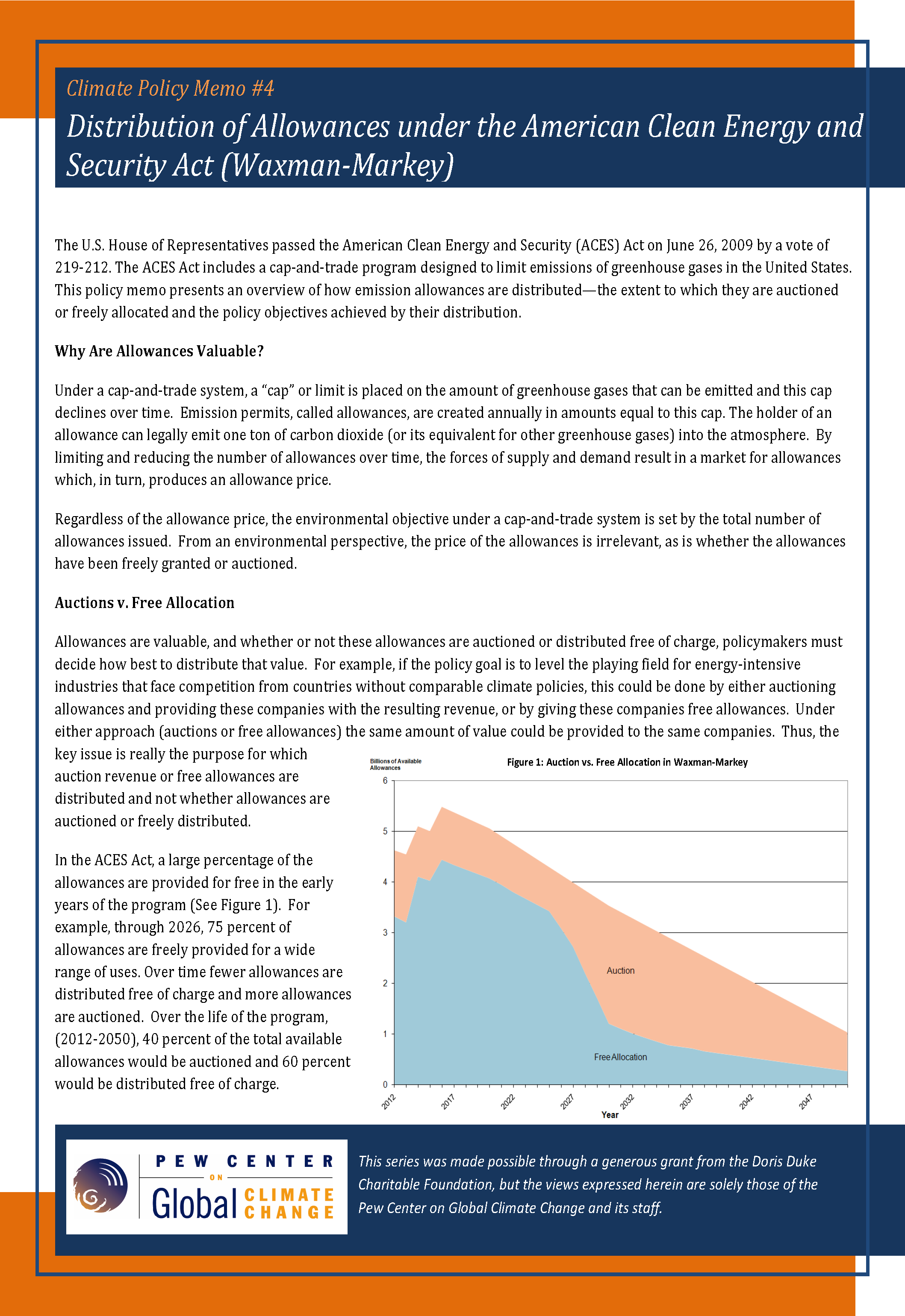 The U.S. House of Representatives passed the American Clean Energy and Security (ACES) Act on June 26, 2009 by a vote of 219-212. The ACES Act includes a cap-and-trade program designed to limit emissions of greenhouse gases in the United States. This policy memo presents an overview of how emission allowances are distributed—the extent to which they are auctioned or freely allocated and the policy objectives achieved by their distribution.