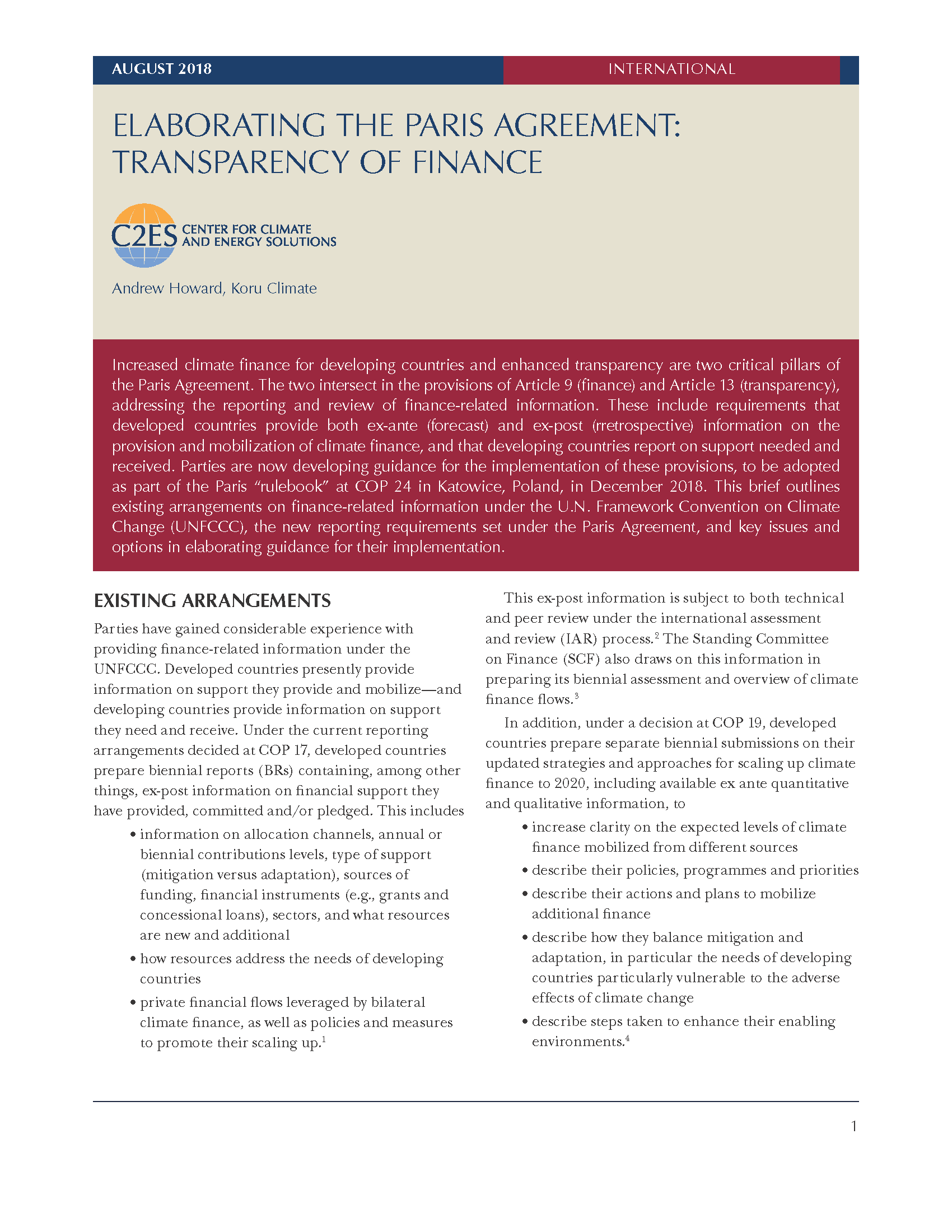 Increased climate finance for developing countries and enhanced transparency are two critical pillars of the Paris Agreement. The two intersect in the provisions of Article 9 (finance) and Article 13 (transparency), addressing the reporting and review of finance-related information. These include requirements that developed countries provide both ex-ante (forecast) and ex-post (retrospective) information on the provision and mobilization of climate finance, and that developing countries report on support needed and received. Parties are now developing guidance for the implementation of these provisions, to be adopted as part of the Paris “rulebook” at COP 24 in Katowice, Poland, in December 2018. This brief outlines existing arrangements on finance-related information under the U.N. Framework Convention on Climate Change (UNFCCC), the new reporting requirements set under the Paris Agreement, and key issues and options in elaborating guidance for their implementation.