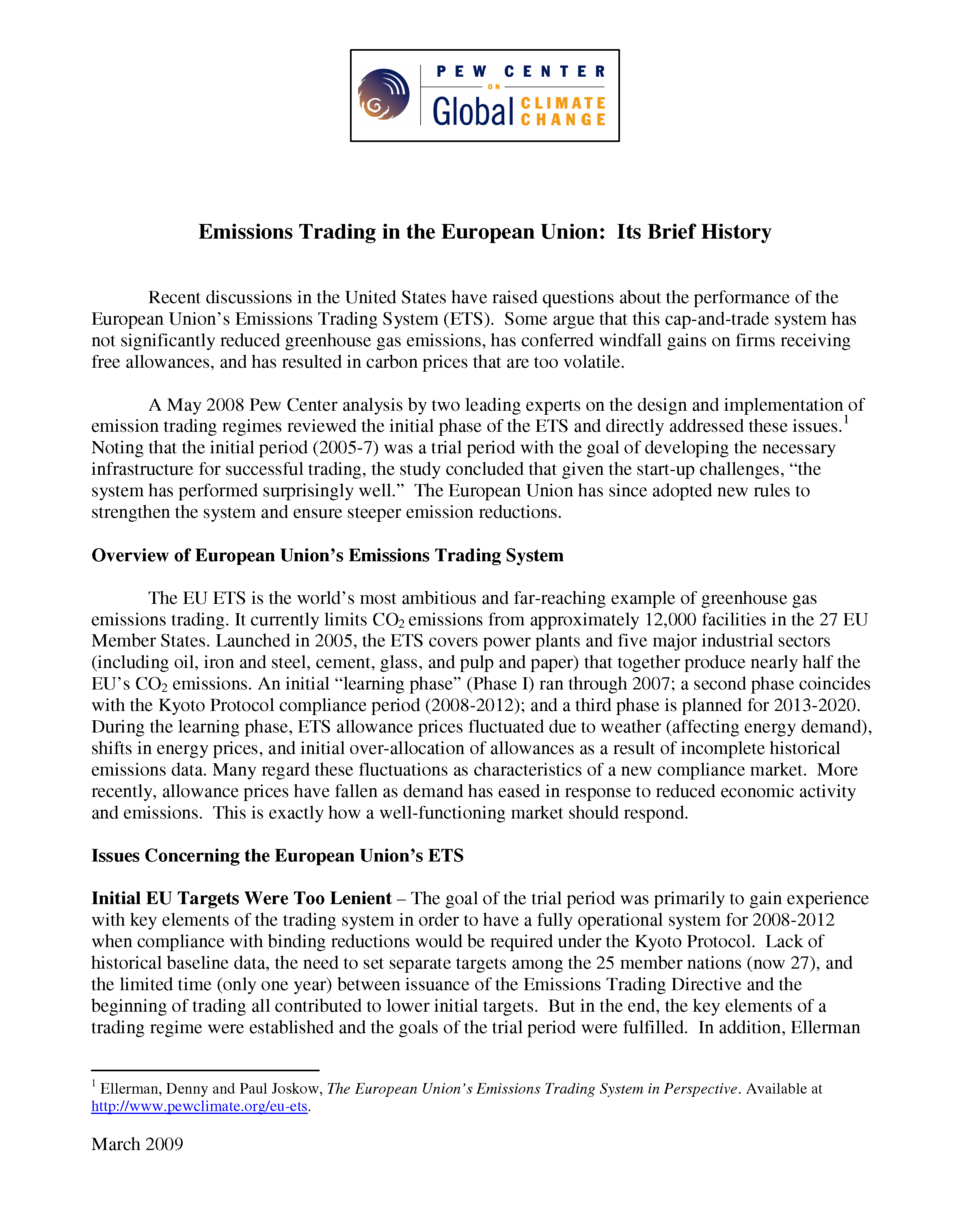 A May 2008 Pew Center analysis by two leading experts on the design and implementation of emission trading regimes reviewed the initial phase of the ETS and directly addressed these issues. Noting that the initial period (2005-7) was a trial period with the goal of developing the necessary infrastructure for successful trading, the study concluded that given the start-up challenges, “the system has performed surprisingly well.” The European Union has since adopted new rules to strengthen the system and ensure steeper emission reductions.