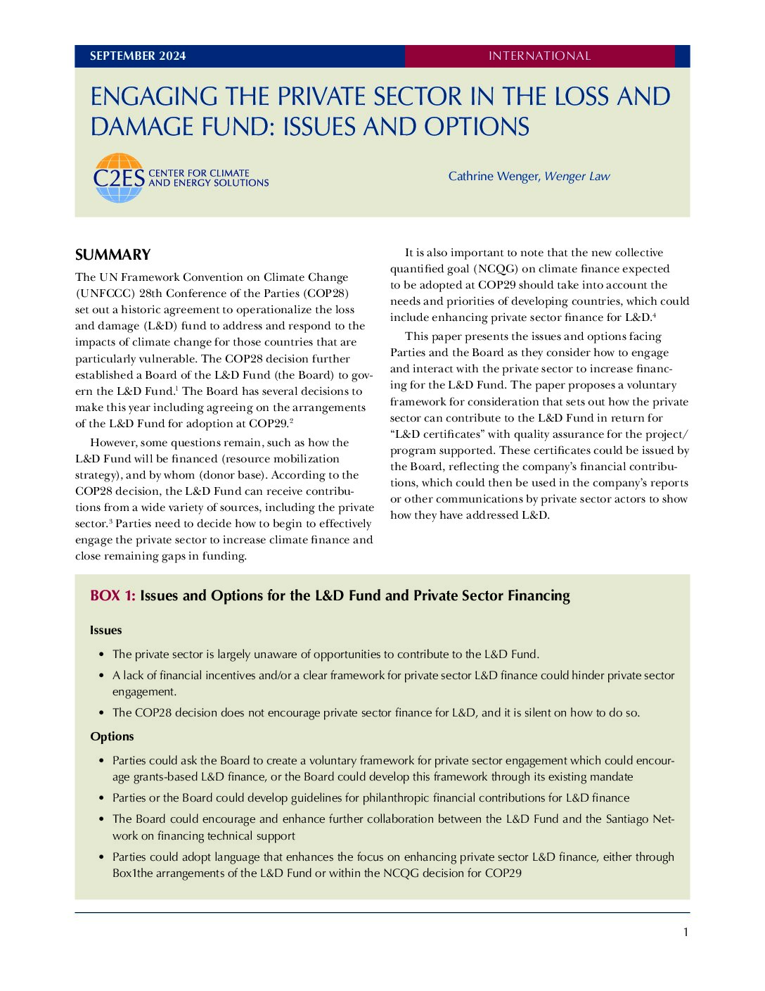 This paper presents the issues and options facing Parties and the Board as they consider how to engage and interact with the private sector to increase financing for the L&D Fund. The paper proposes a voluntary framework for consideration that sets out how the private sector can contribute to the L&D Fund in return for “L&D certificates” with quality assurance for the project/ program supported. These certificates could be issued by the Board, reflecting the company’s financial contributions, which could then be used in the company’s reports or other communications by private sector actors to show how they have addressed L&D.