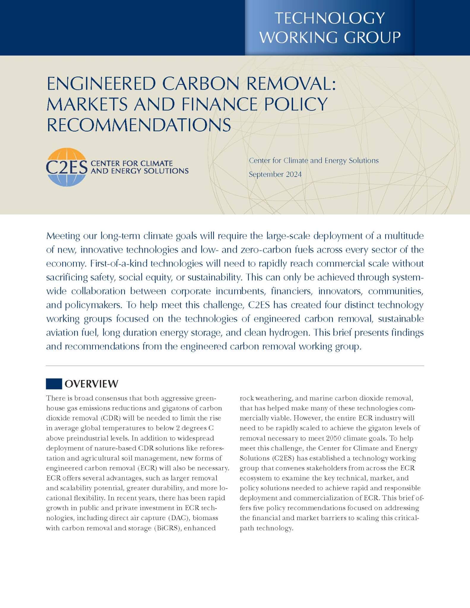 There is broad consensus that both aggressive greenhouse gas emissions reductions and gigatons of carbon dioxide removal (CDR) will be needed to limit the rise in average global temperatures to below 2 degrees C above preindustrial levels. In addition to widespread deployment of nature-based CDR solutions like reforestation and agricultural soil management, new forms of engineered carbon removal (ECR) will also be necessary. ECR offers several advantages, such as larger removal and scalability potential, greater durability, and more locational flexibility. In recent years, there has been rapid growth in public and private investment in ECR technologies, including direct air capture (DAC), biomass with carbon removal and storage (BiCRS), enhanced rock weathering, and marine carbon dioxide removal, that has helped make many of these technologies commercially viable. However, the entire ECR industry will need to be rapidly scaled to achieve the gigaton levels of removal necessary to meet 2050 climate goals. To help meet this challenge, the Center for Climate and Energy Solutions (C2ES) has established a technology working group that convenes stakeholders from across the ECR ecosystem to examine the key technical, market, and policy solutions needed to achieve rapid and responsible deployment and commercialization of ECR. This brief offers five policy recommendations focused on addressing the financial and market barriers to scaling this critical-path technology.