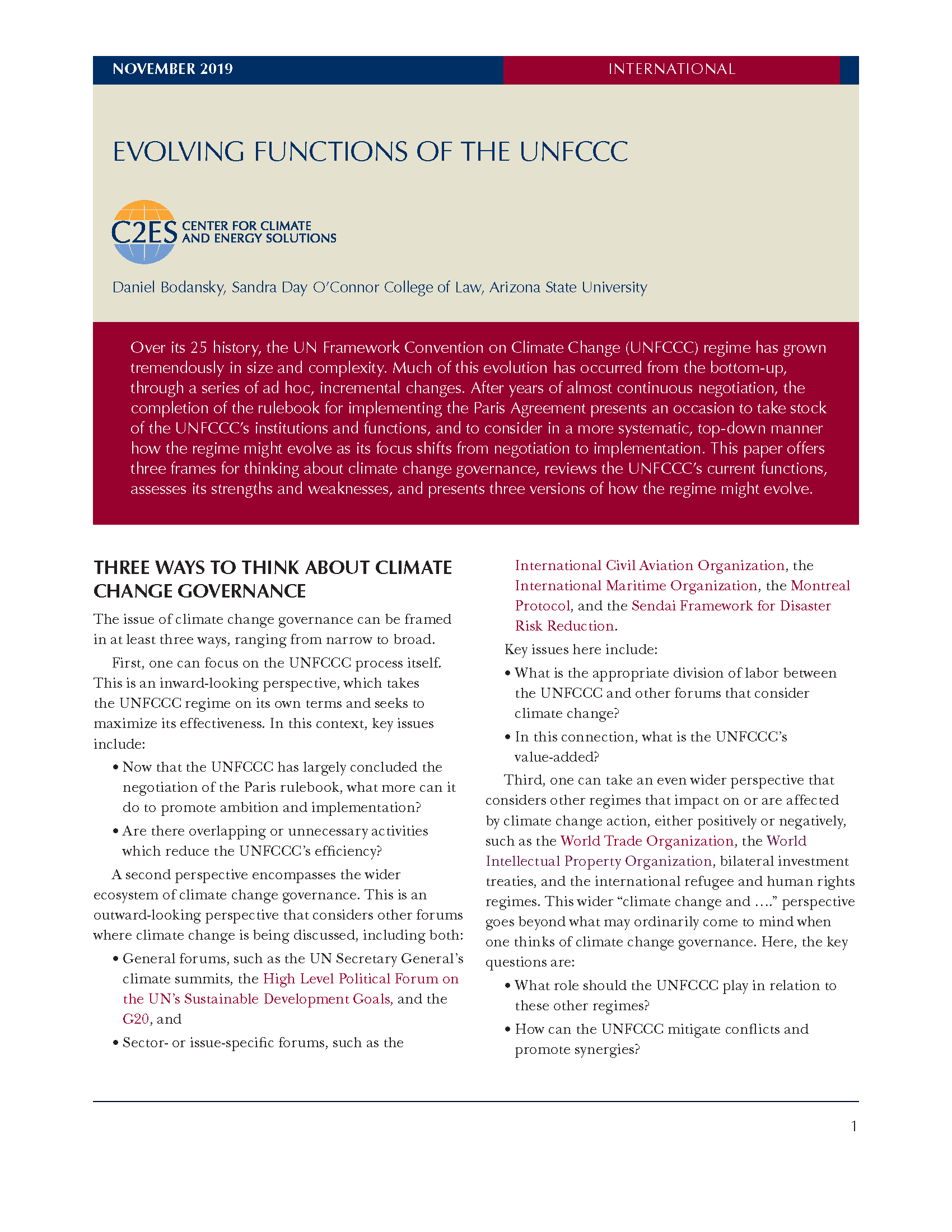 Over its 25 history, the UN Framework Convention on Climate Change (UNFCCC) regime has grown tremendously in size and complexity. Much of this evolution has occurred from the bottom-up, through a series of ad hoc, incremental changes. After years of almost continuous negotiation, the completion of the rulebook for implementing the Paris Agreement presents an occasion to take stock of the UNFCCC’s institutions and functions, and to consider in a more systematic, top-down manner how the regime might evolve as its focus shifts from negotiation to implementation. This paper offers three frames for thinking about climate change governance, reviews the UNFCCC’s current functions, assesses its strengths and weaknesses, and presents three versions of how the regime might evolve.