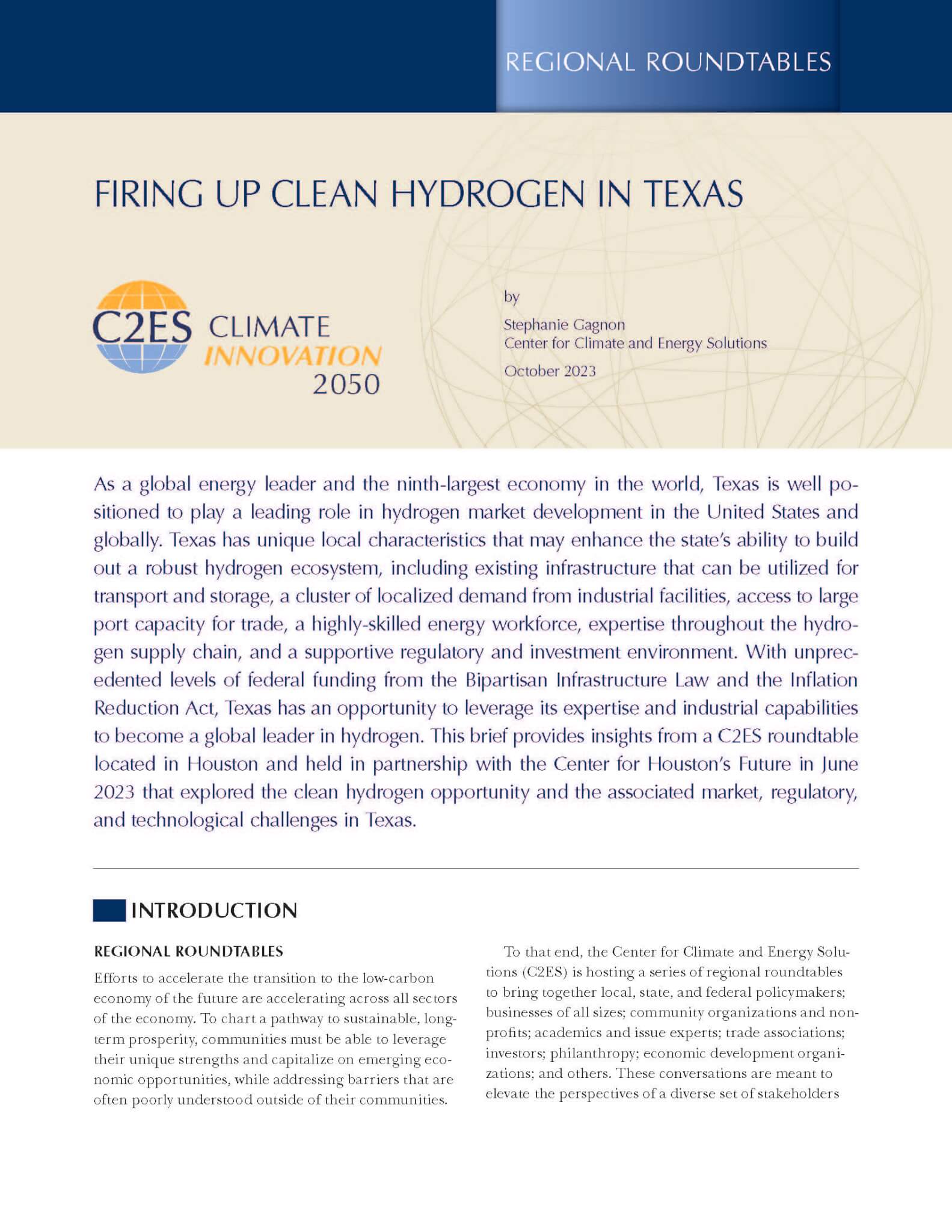 As a global energy leader and the ninth-largest economy in the world, Texas is well-positioned to play a leading role in hydrogen market development in the United States and globally. Texas has unique local characteristics that may enhance the state’s ability to build out a robust hydrogen ecosystem, including existing infrastructure that can be utilized for transport and storage, a cluster of localized demand from industrial facilities, access to large port capacity for trade, a highly-skilled energy workforce, expertise throughout the hydrogen supply chain, and a supportive regulatory and investment environment. With unprecedented levels of federal funding from the Bipartisan Infrastructure Law and the Inflation Reduction Act, Texas has an opportunity to leverage its expertise and industrial capabilities to become a global leader in hydrogen. This brief provides insights from a C2ES roundtable located in Houston and held in partnership with the Center for Houston’s Future in June 2023 that explored the clean hydrogen opportunity and the associated market, regulatory, and technological challenges in Texas.