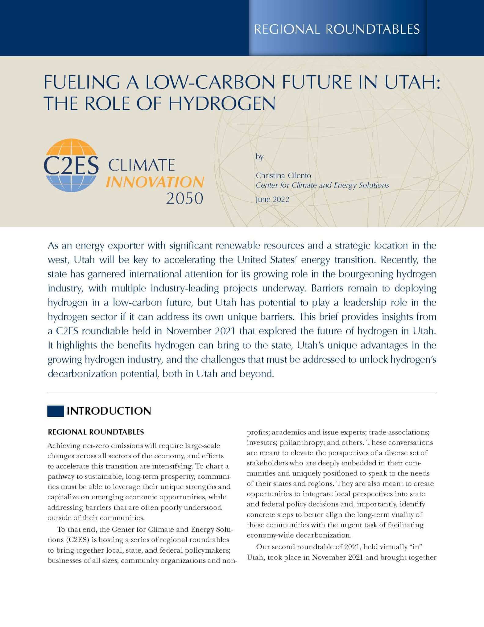 As an energy exporter with significant renewable resources and a strategic location in the west, Utah will be key to accelerating the United States’ energy transition. Recently, the state has garnered international attention for its growing role in the bourgeoning hydrogen industry, with multiple industry-leading projects underway. Barriers remain to deploying hydrogen in a low-carbon future, but Utah has potential to play a leadership role in the hydrogen sector if it can address its own unique barriers. This brief provides insights from a C2ES roundtable held in November 2021 that explored the future of hydrogen in Utah. It highlights the benefits hydrogen can bring to the state, Utah’s unique advantages in the growing hydrogen industry, and the challenges that must be addressed to unlock hydrogen’s decarbonization potential, both in Utah and beyond.