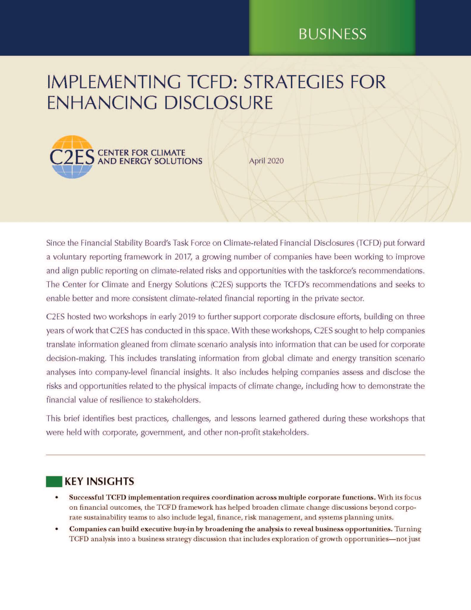 Since the Financial Stability Board’s Task Force on Climate-related Financial Disclosures (TCFD) put forward a voluntary reporting framework in 2017, a growing number of companies have been working to improve and align public reporting on climate-related risks and opportunities with the task force’s recommendations. The Center for Climate and Energy Solutions (C2ES) supports the TCFD’s recommendations and seeks to enable better and more consistent climate-related financial reporting in the private sector.