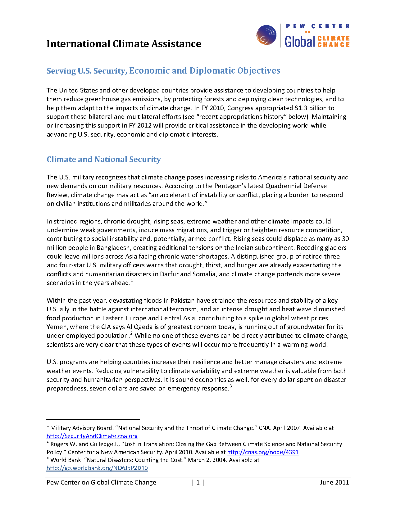The United States and other developed countries provide assistance to developing countries to help them reduce greenhouse gas emissions, by protecting forests and deploying clean technologies, and to help them adapt to the impacts of climate change. In FY 2010, Congress appropriated $1.3 billion to support these bilateral and multilateral efforts (see “recent appropriations history” below). Maintaining or increasing this support in FY 2012 will provide critical assistance in the developing world while advancing U.S. security, economic and diplomatic interests.