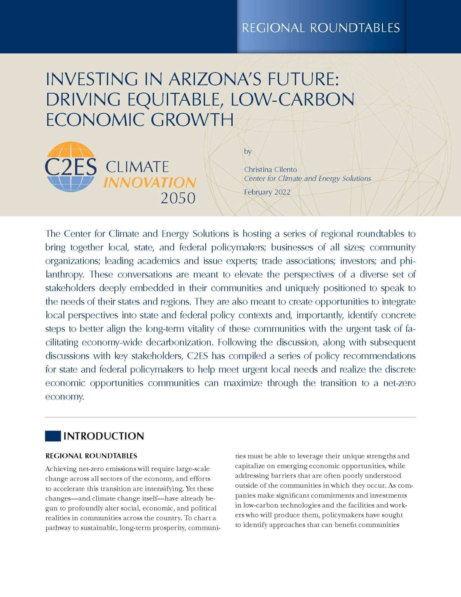 The Center for Climate and Energy Solutions is hosting a series of regional roundtables to bring together local, state, and federal policymakers; businesses of all sizes; community organizations; leading academics and issue experts; trade associations; investors; and philanthropy. These conversations are meant to elevate the perspectives of a diverse set of stakeholders deeply embedded in their communities and uniquely positioned to speak to the needs of their states and regions. They are also meant to create opportunities to integrate local perspectives into state and federal policy contexts and, importantly, identify concrete steps to better align the long-term vitality of these communities with the urgent task of facilitating economy-wide decarbonization. Following the discussion, along with subsequent discussions with key stakeholders, C2ES has compiled a series of policy recommendations for state and federal policymakers to help meet urgent local needs and realize the discrete economic opportunities communities can maximize through the transition to a net-zero economy.