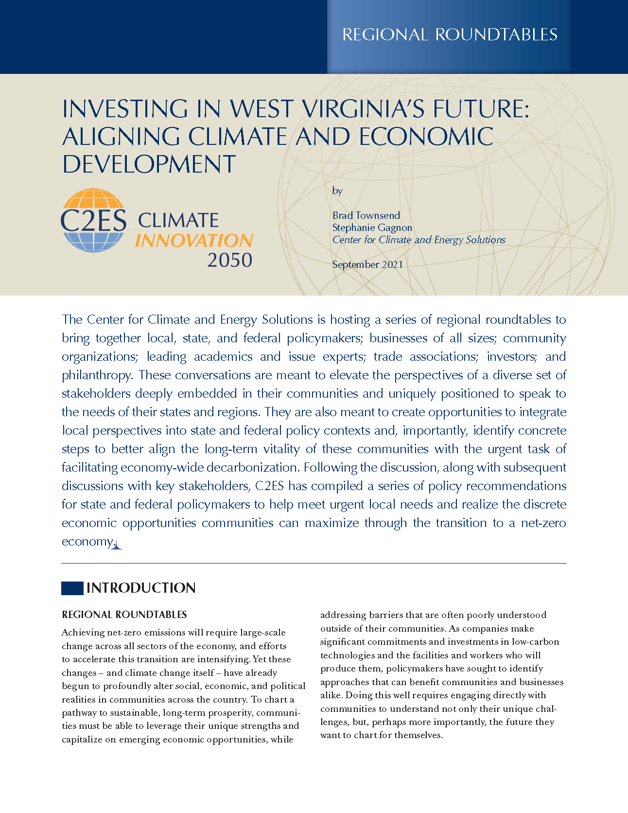 The Center for Climate and Energy Solutions is hosting a series of regional roundtables to bring together local, state, and federal policymakers; businesses of all sizes; community organizations; leading academics and issue experts; trade associations; investors; and philanthropy. These conversations are meant to elevate the perspectives of a diverse set of stakeholders deeply embedded in their communities and uniquely positioned to speak to the needs of their states and regions. They are also meant to create opportunities to integrate local perspectives into state and federal policy contexts and, importantly, identify concrete steps to better align the long-term vitality of these communities with the urgent task of facilitating economy-wide decarbonization. Following the discussion, along with subsequent discussions with key stakeholders, C2ES has compiled a series of policy recommendations for state and federal policymakers to help meet urgent local needs and realize the discrete economic opportunities communities can maximize through the transition to a net-zero economy.