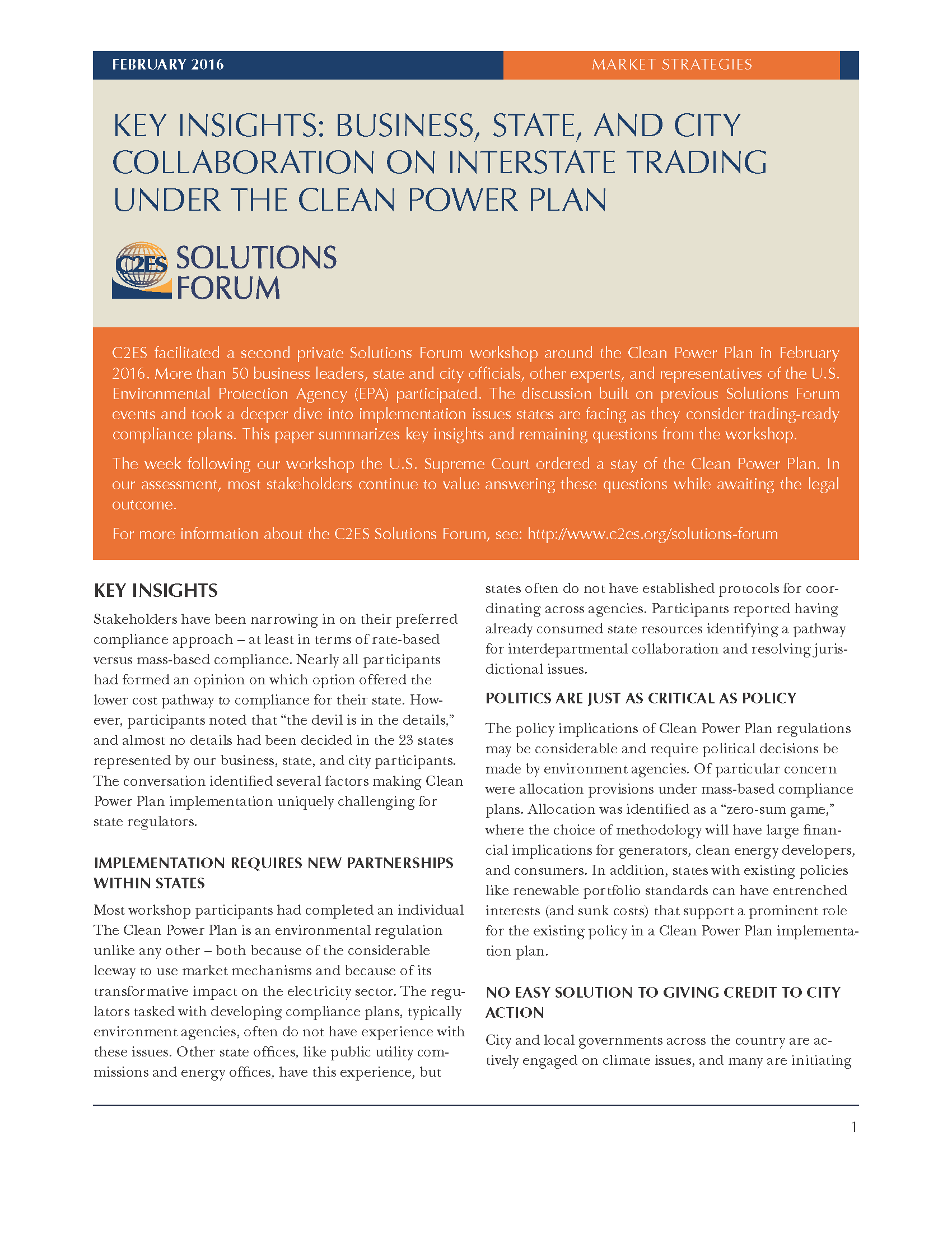 C2ES facilitated a second private Solutions Forum workshop around the Clean Power Plan in February 2016. More than 50 business leaders, state and city officials, other experts, and representatives of the U.S. Environmental Protection Agency (EPA) participated. The discussion built on previous Solutions Forum events and took a deeper dive into implementation issues states are facing as they consider trading-ready compliance plans. This paper summarizes key insights and remaining questions from the workshop.