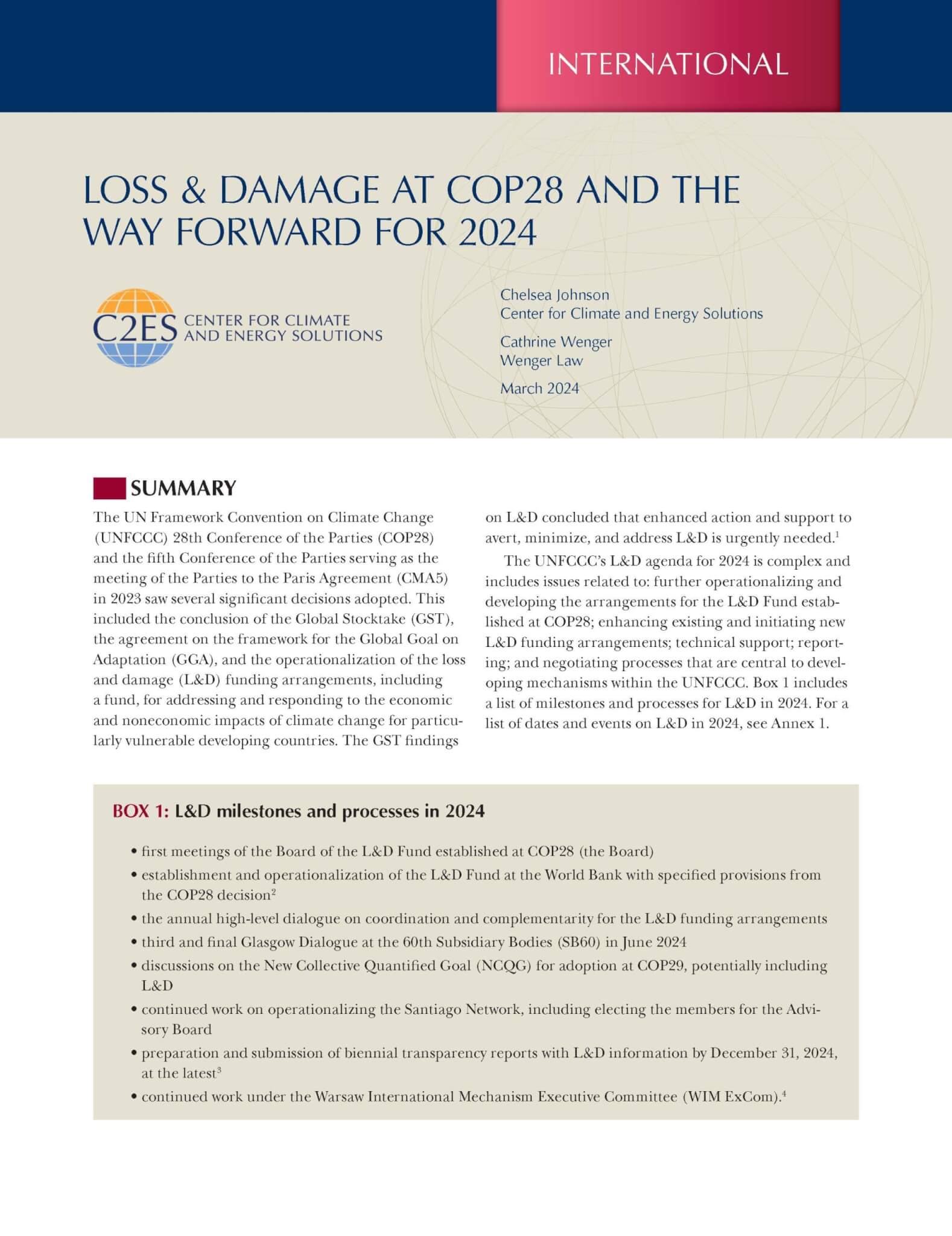 The UNFCCC’s Loss and Damage agenda for 2024 is complex and includes issues related to: further operationalizing and developing the arrangements for the L&D Fund established at COP28; enhancing existing and initiating new L&D funding arrangements; technical support; reporting; and negotiating processes that are central to developing mechanisms within the UNFCCC.