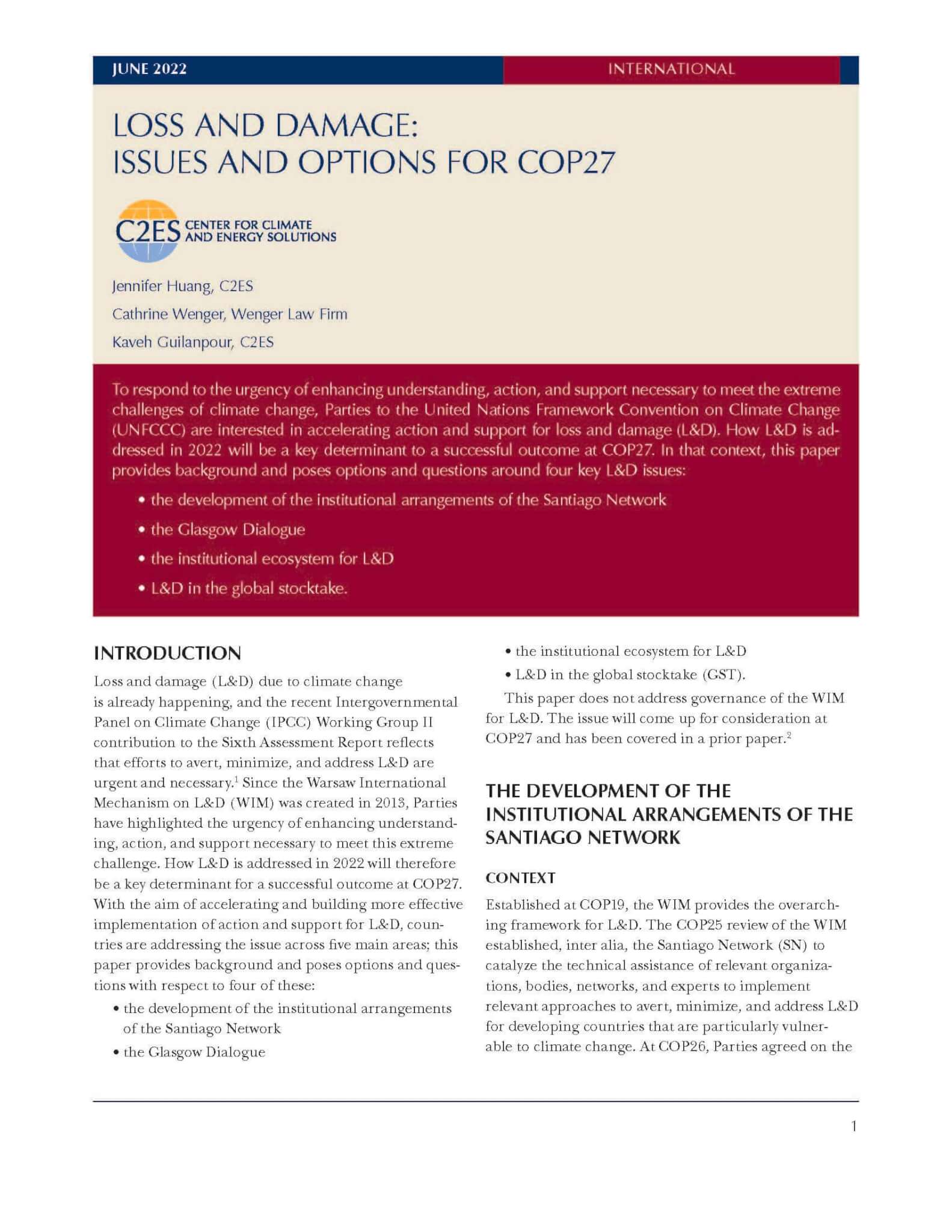 To respond to the urgency of enhancing understanding, action, and support necessary to meet the extreme challenges of climate change, Parties to the United Nations Framework Convention on Climate Change (UNFCCC) need to accelerate action and support for loss and damage (L&D). How L&D is addressed in 2022 will be a key determinant to a successful outcome at COP27. In that context, this paper provides background and poses options and questions around four key L&D issues: