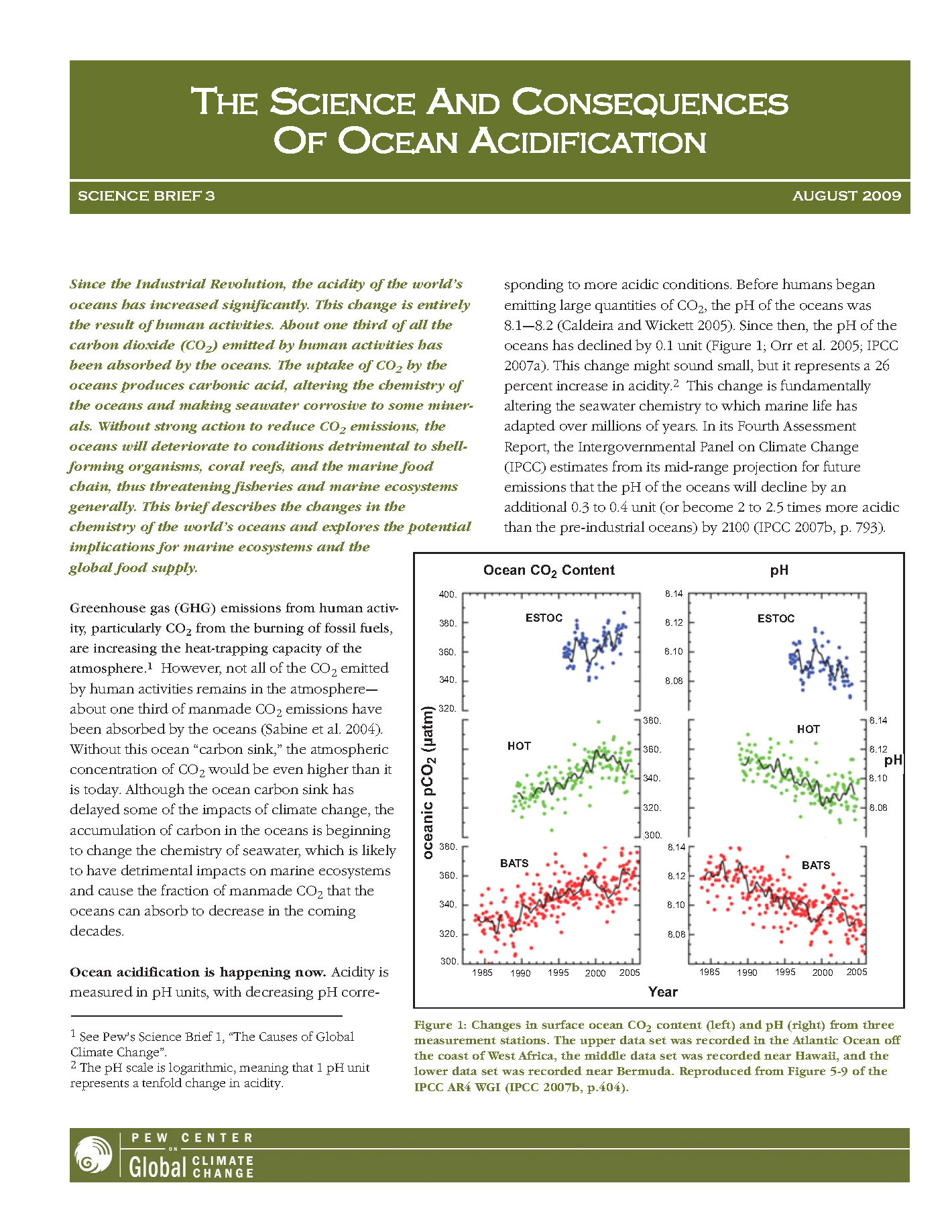 Since the Industrial Revolution, the acidity of the world’s oceans has increased significantly. This change is entirely the result of human activities. About one third of all the carbon dioxide (CO2) emitted by human activities has been absorbed by the oceans. The uptake of CO2 by the oceans produces carbonic acid, altering the chemistry of the oceans and making seawater corrosive to some minerals. Without strong action to reduce CO2 emissions, the oceans will deteriorate to conditions detrimental to shell-forming organisms, coral reefs, and the marine food chain, thus threatening fisheries and marine ecosystems generally. This brief describes the changes in the chemistry of the world’s oceans and explores the potential implications for marine ecosystems and the global food supply.