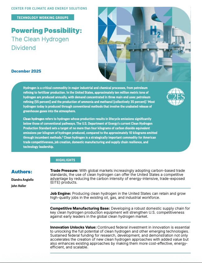 Hydrogen is a critical commodity in major industrial and chemical processes, from petroleum refining to fertilizer production. In the United States, approximately ten million metric tons of hydrogen are produced annually, with demand concentrated in three main end uses: petroleum refining (55 percent) and the production of ammonia and methanol (collectively 35 percent). Most hydrogen today is produced through conventional methods that involve the unabated release of greenhouse gases into the atmosphere. Clean hydrogen refers to hydrogen whose production results in lifecycle emissions significantly below those of conventional pathways. The U.S. Department of Energy’s current Clean Hydrogen Production Standard sets a target of no more than four kilograms of carbon dioxide equivalent emissions per kilogram of hydrogen produced, compared to the approximately 10 kilograms emitted through incumbent methods. Clean hydrogen is a strategically important commodity for American trade competitiveness, job creation, domestic manufacturing and supply chain resilience, and technology leadership.