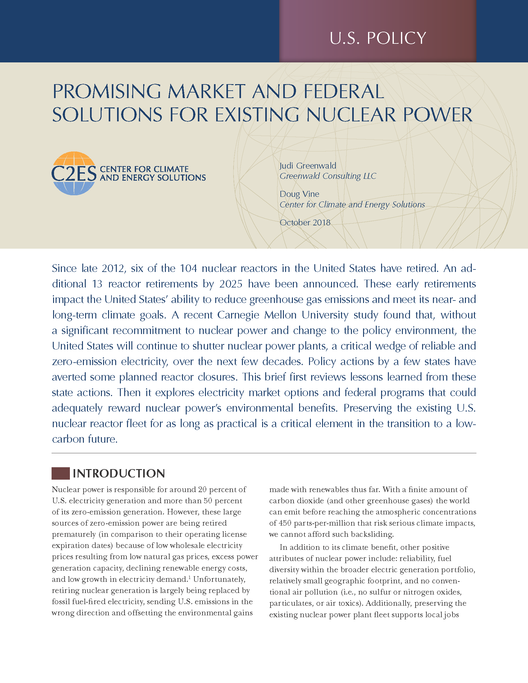 Since late 2012, six of the 104 nuclear reactors in the United States have retired. An additional 13 reactor retirements by 2025 have been announced. These early retirements impact the United States’ ability to reduce greenhouse gas emissions and meet its near- and long-term climate goals. A recent Carnegie Mellon University study found that, without a significant recommitment to nuclear power and change to the policy environment, the United States will continue to shutter nuclear power plants, a critical wedge of reliable and zero-emission electricity, over the next few decades. Policy actions by a few states have averted some planned reactor closures. This brief first reviews lessons learned from these state actions. Then it explores electricity market options and federal programs that could adequately reward nuclear power’s environmental benefits. Preserving the existing U.S. nuclear reactor fleet for as long as practical is a critical element in the transition to a low-carbon future.