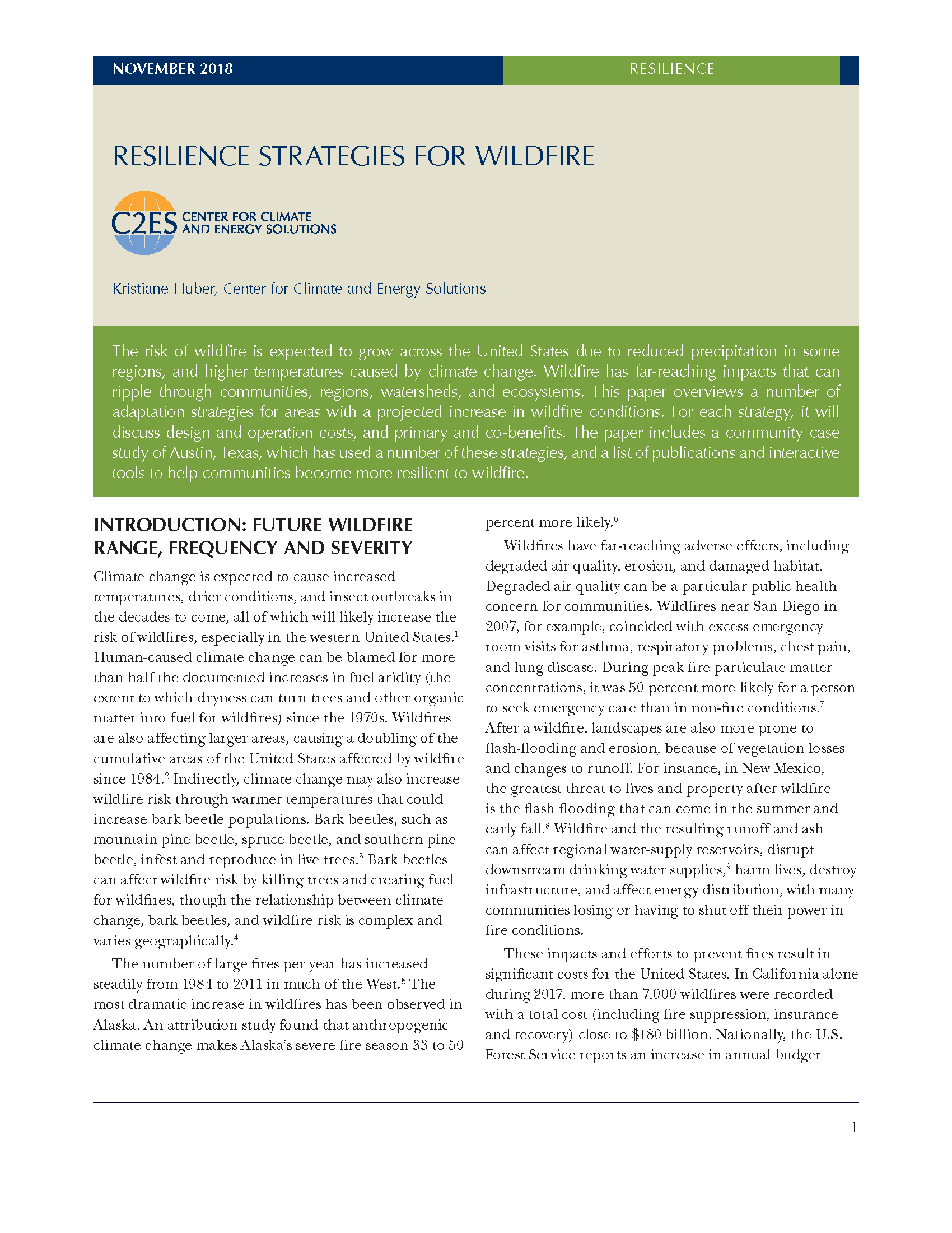 The risk of wildfire is expected to grow across the United States due to reduced precipitation in some regions, and higher temperatures caused by climate change. Wildfire has far-reaching impacts that can ripple through communities, regions, watersheds, and ecosystems. This paper overviews a number of adaptation strategies for areas with a projected increase in wildfire conditions. For each strategy, it will discuss design and operation costs, and primary and co-benefits. The paper includes a community case study of Austin, Texas, which has used a number of these strategies, and a list of publications and interactive tools to help communities become more resilient to wildfire.
