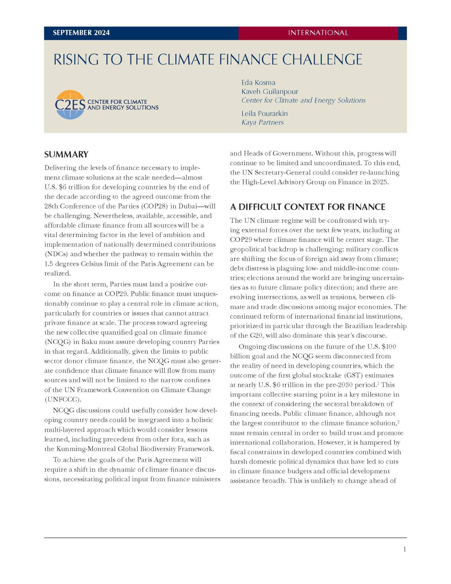 Delivering the levels of finance necessary to implement climate solutions at the scale needed—almost U.S. $6 trillion for developing countries by the end of the decade according to the agreed outcome from the 28th Conference of the Parties (COP28) in Dubai—will be challenging. Nevertheless, available, accessible, and affordable climate finance from all sources will be a vital determining factor in the level of ambition and implementation of nationally determined contributions (NDCs) and whether the pathway to remain within the 1.5 degrees Celsius limit of the Paris Agreement can be realized.