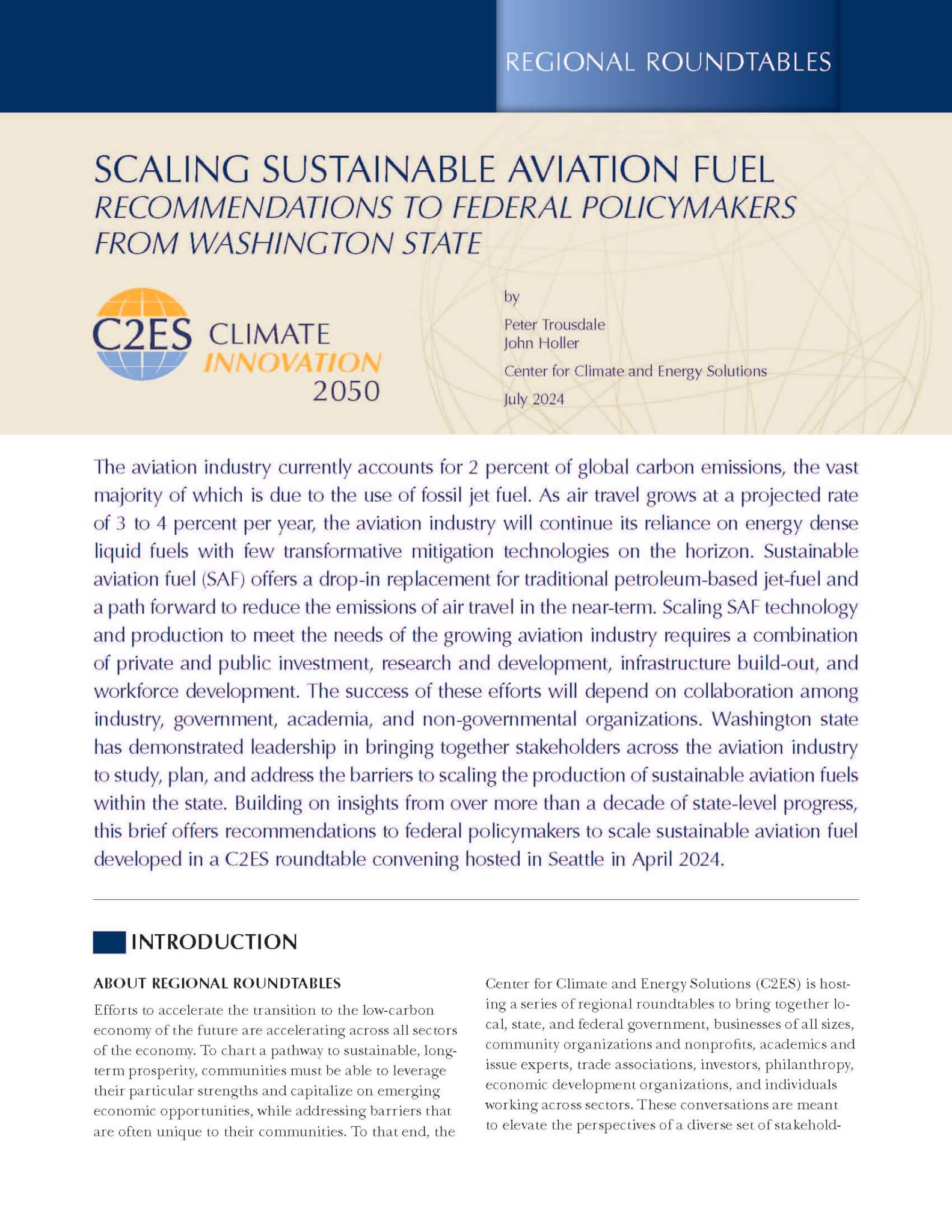 Washington state has demonstrated leadership in bringing together stakeholders across the aviation industry to study, plan, and address the barriers to scaling the production of sustainable aviation fuels within the state. Building on insights from over more than a decade of state-level progress, this brief offers recommendations to federal policymakers to scale sustainable aviation fuel developed in a C2ES roundtable convening hosted in Seattle in April 2024.