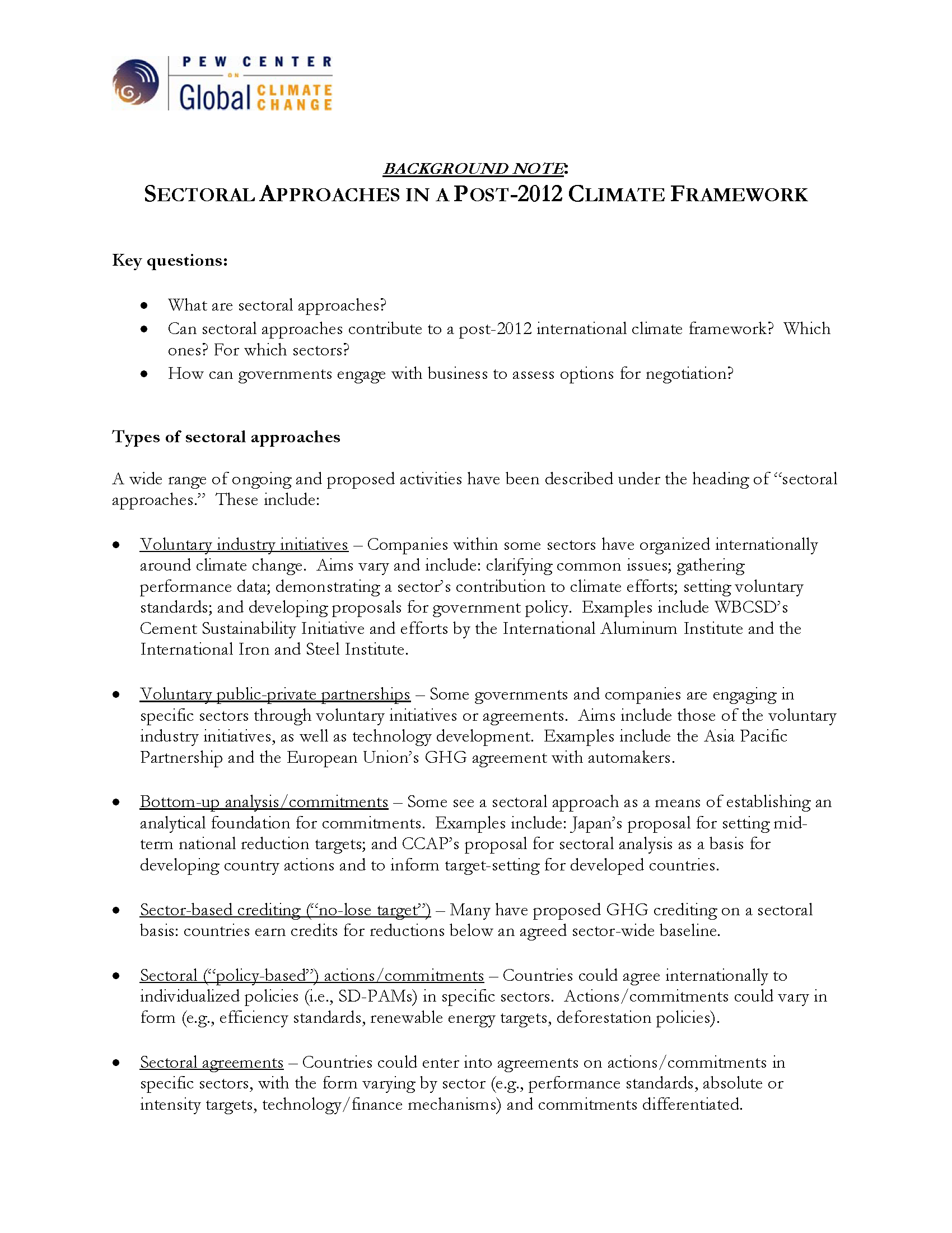 Since climate change first emerged as an international issue in the late 1980s, a recurring policy question has been whether to address it on a comprehensive or a sector-by-sector basis. In recent years, sectoral approaches have received renewed attention and are among the options proposed for the post-2012 period.