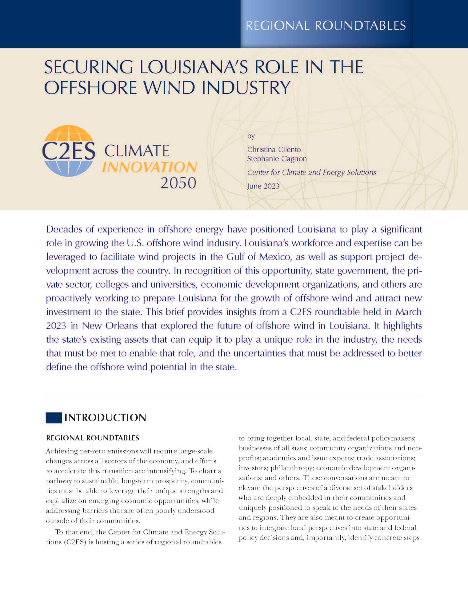 Decades of experience in offshore energy have positioned Louisiana to play a significant role in growing the U.S. offshore wind industry. Louisiana’s workforce and expertise can be leveraged to facilitate wind projects in the Gulf of Mexico, as well as support project development across the country. In recognition of this opportunity, state government, the private sector, colleges and universities, economic development organizations, and others are proactively working to prepare Louisiana for the growth of offshore wind and attract new investment to the state. This brief provides insights from a C2ES roundtable held in March 2023 in New Orleans that explored the future of offshore wind in Louisiana. It highlights the state’s existing assets that can equip it to play a unique role in the industry, the needs that must be met to enable that role, and the uncertainties that must be addressed to better define the offshore wind potential in the state.